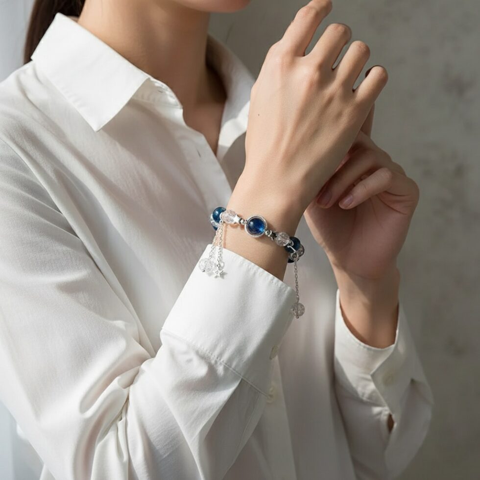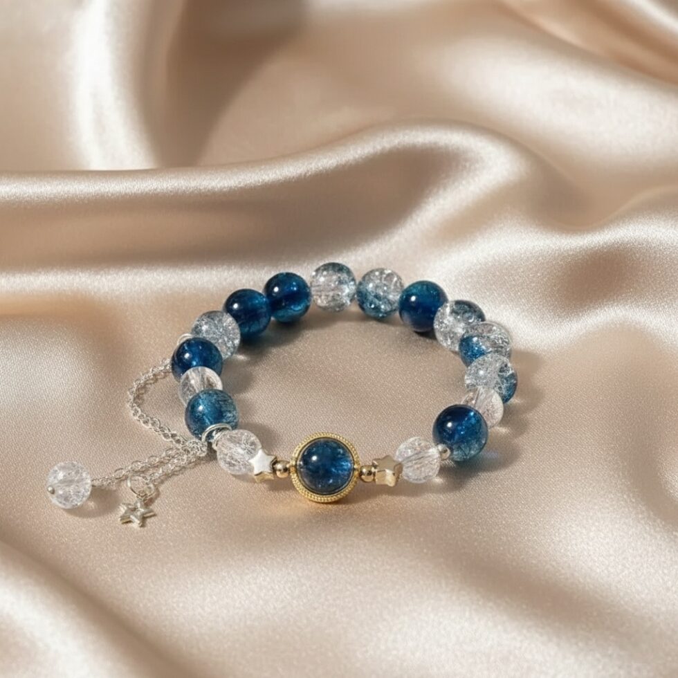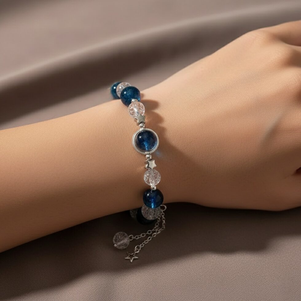 Gaze into the depths of the universe with this enchanting bracelet. It features brilliant deep blue and clear cracked crystal beads, centered by a large, luminous “galaxy” bead. Finished with delicate silver star charms, it’s a stunning piece of wearable celestial art.
