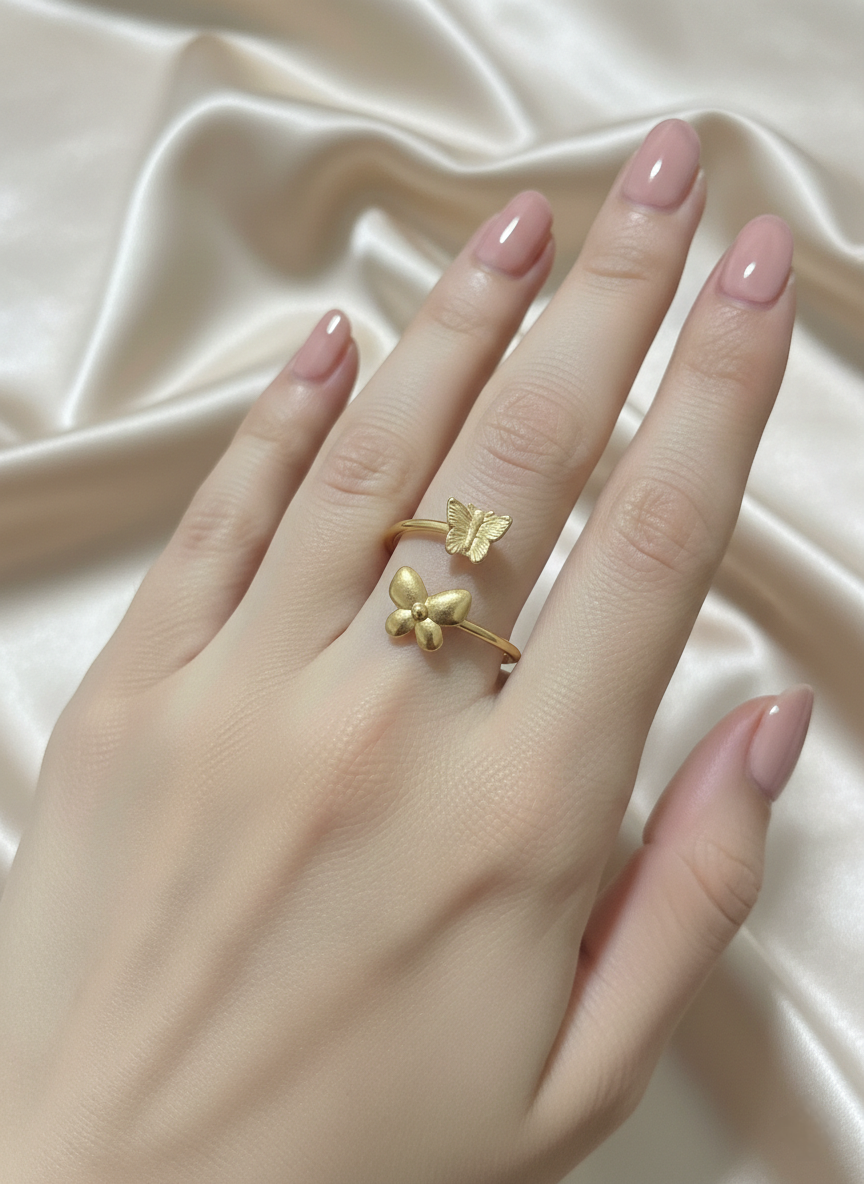The Butterfly Bloom Ring brings together the beauty of nature with a delicate open-band design. Featuring a graceful butterfly on one end and a subtle floral motif on the other, this ring symbolises freedom, growth, and femininity. Finished in polished gold, it’s a versatile piece that adds effortless charm to everyday wear or special moments.