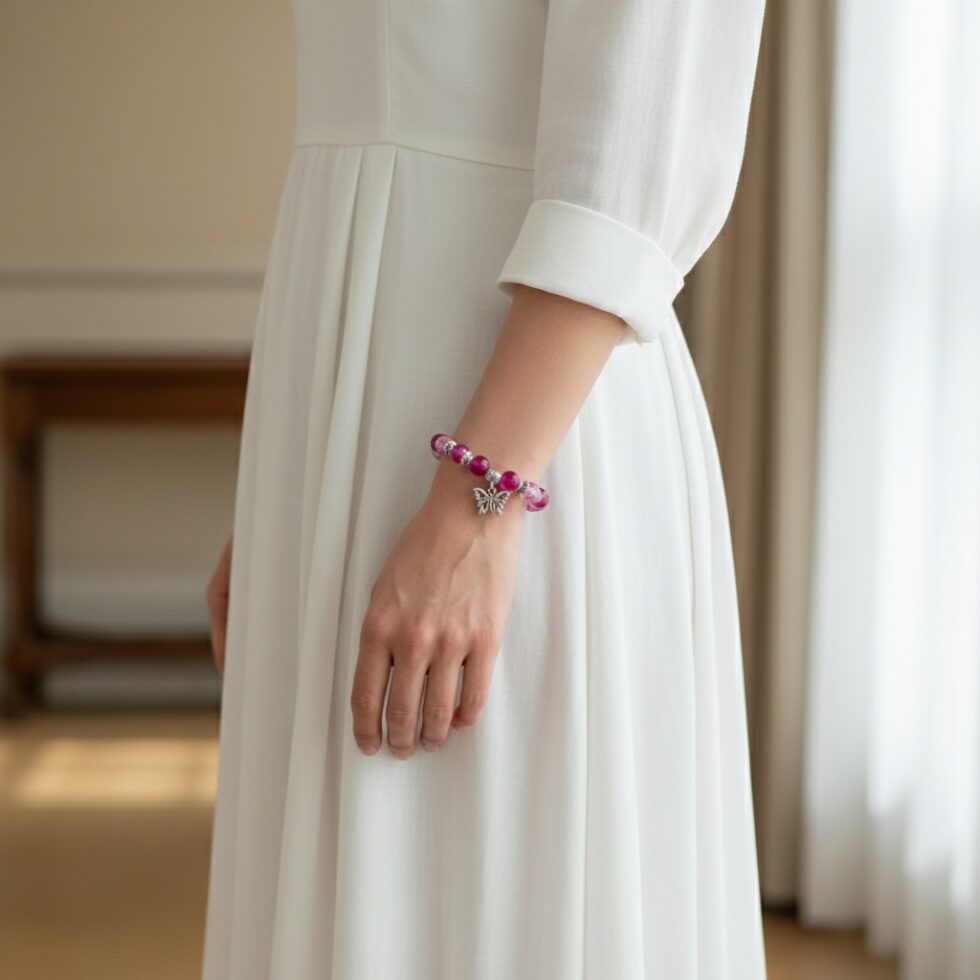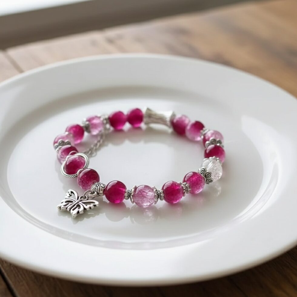 Embrace vibrant charm with this stunning beaded bracelet! Featuring smooth, glossy crystal beads that graduate from soft pink to bright fuchsia, accented by ornate silver-tone spacers and a delightful butterfly charm. A perfect, personalized accessory.