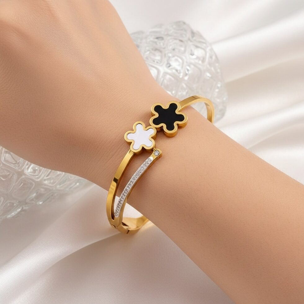 A refined gold-tone bangle featuring two iconic clover motifs in contrasting black and white enamel, accented with subtle crystal detailing. Symbolizing luck, balance, and timeless elegance, this piece is perfect for everyday wear or effortless layering.