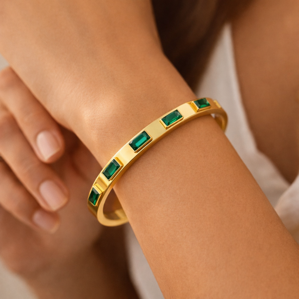 Sleek and sophisticated, the Emerald Arc Gold Bangle features a polished gold finish accented with precisely set emerald-green rectangular stones. Its clean silhouette and radiant shine make it a timeless statement for everyday elegance or elevated evening styling. Designed to layer beautifully or wear solo for refined impact.