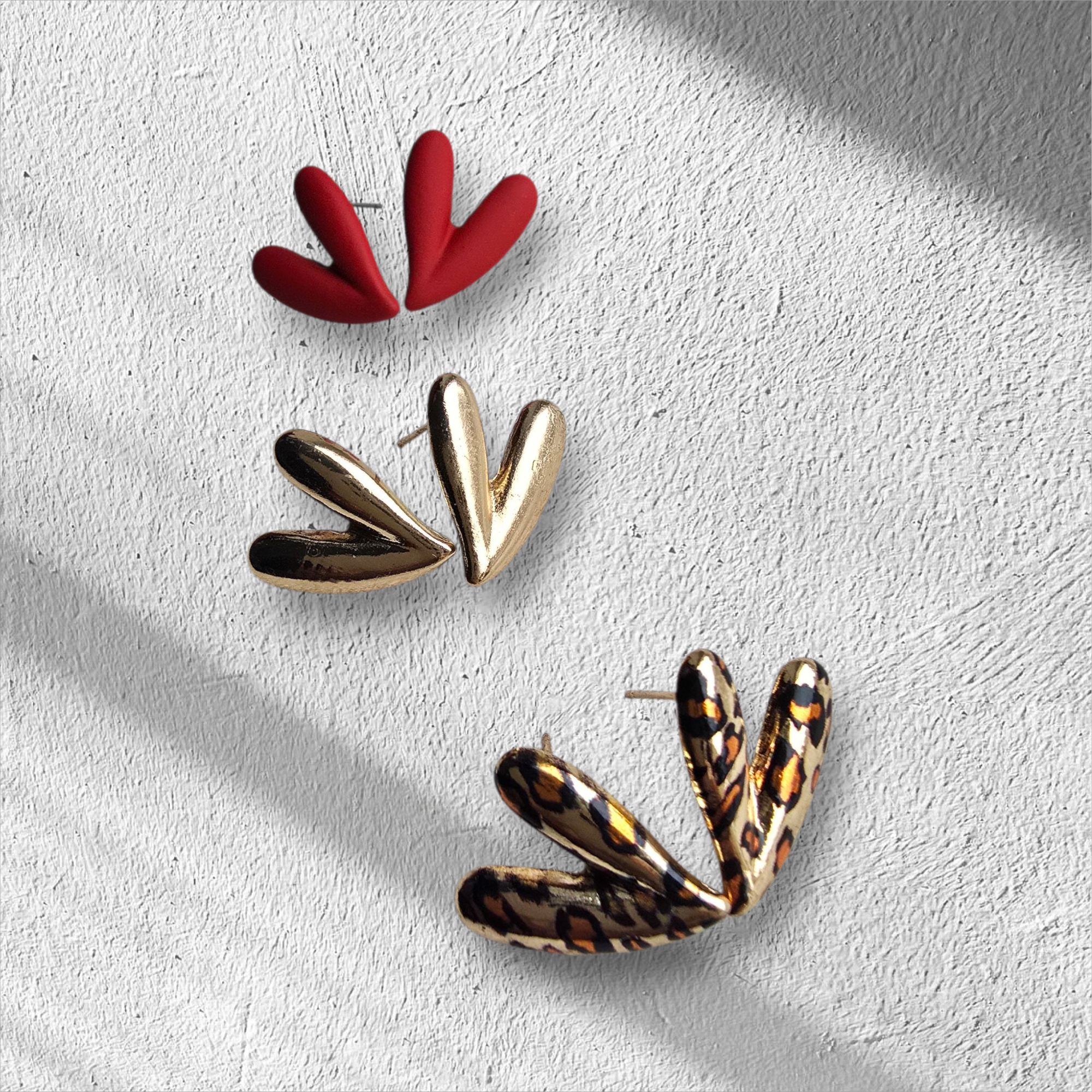 Design: Features three distinct, overlapping petal or heart shapes arranged as a cluster that sits on the earlobe.