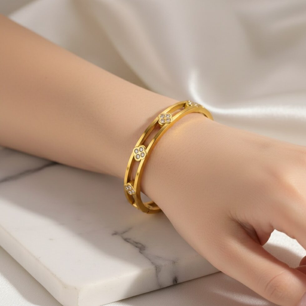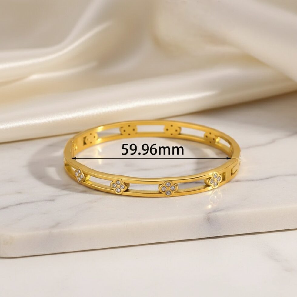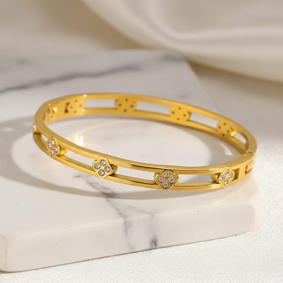 Delicate yet radiant, the Flora Spark Gold Bangle features an elegant openwork gold design accented with shimmering crystal floral motifs. Lightweight and beautifully polished, this bangle adds subtle sparkle and graceful charm to everyday outfits and special occasions alike