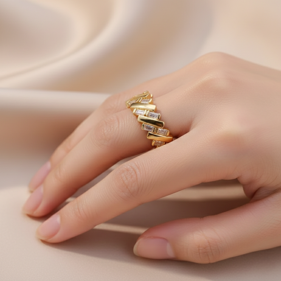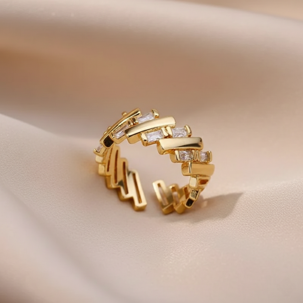 Bold yet refined, the Gilded Steps Zircon Ring features a striking geometric design with polished gold-tone links accented by sleek baguette-cut zircon stones. Its open, adjustable silhouette offers a modern edge while ensuring a comfortable fit. Perfect for elevating everyday style or adding a contemporary touch to evening looks, this ring is a statement of confident elegance.