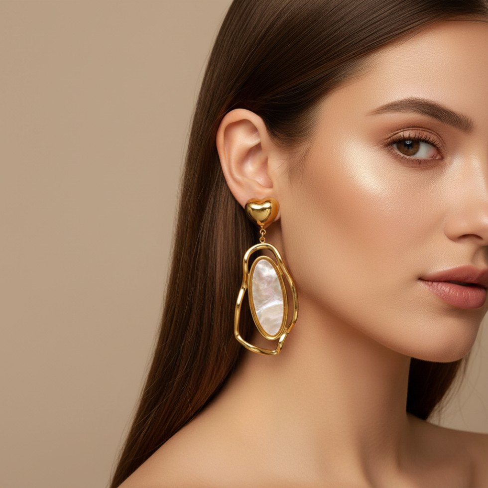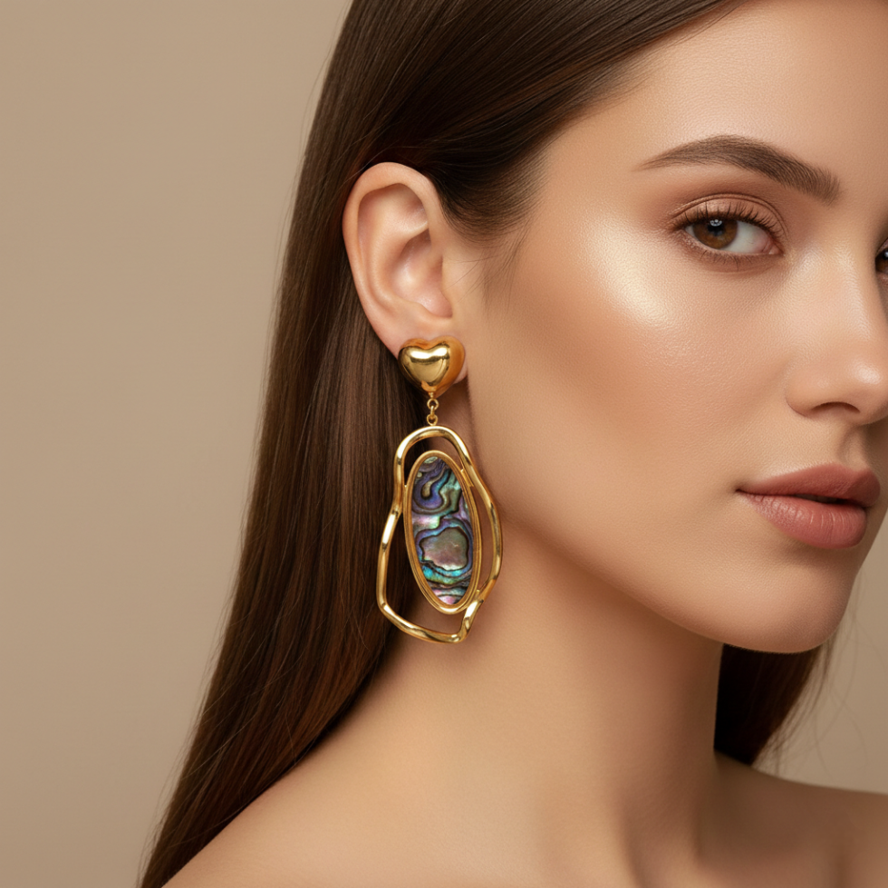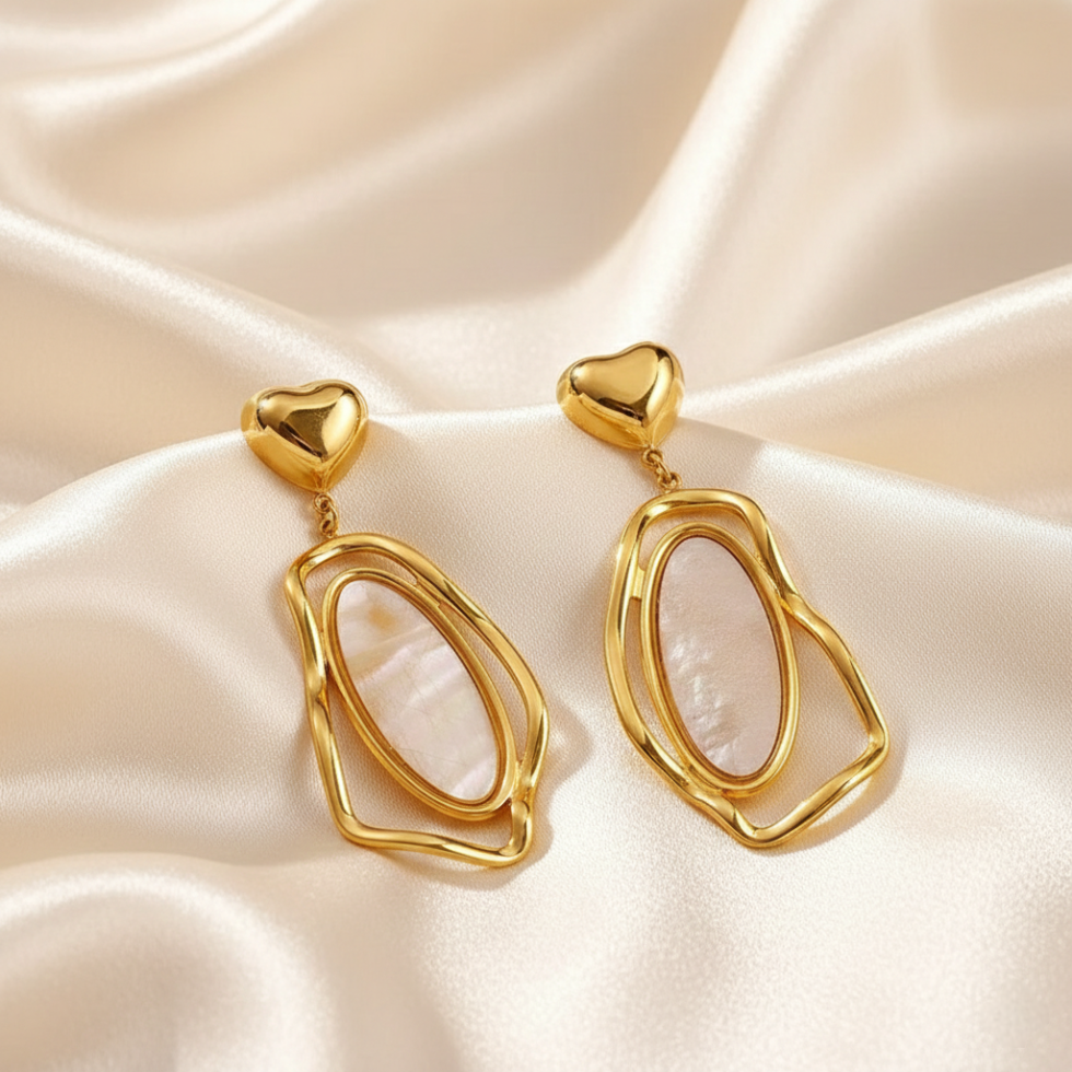 Elegant and expressive, the Golden Aura Drop Earrings feature a polished heart stud paired with a fluid, abstract gold frame that cradles a luminous natural shell inlay. The organic shapes and iridescent tones create a perfect balance of modern artistry and timeless charm. Lightweight yet eye-catching, these earrings add a graceful glow to both everyday looks and special occasions.