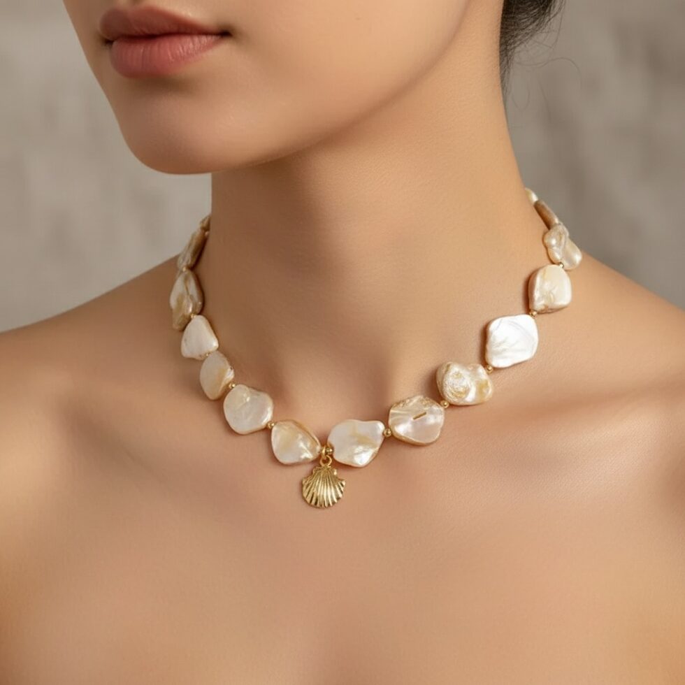 Design: Natural, irregular, flat bead design with a charming scallop shell charm.