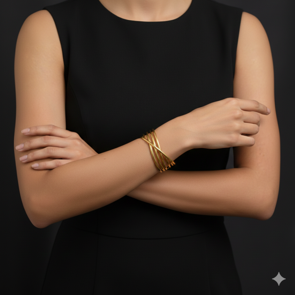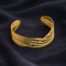 The Golden Wave Cuff Bangle features a flowing multi-strand design that gracefully wraps around the wrist, creating a beautiful sense of movement and depth. Crafted with a high-polish gold finish, its open cuff structure offers a comfortable and adjustable fit while maintaining a bold, elegant silhouette. Minimal yet striking, this bangle effortlessly elevates both everyday outfits and special occasion looks.
