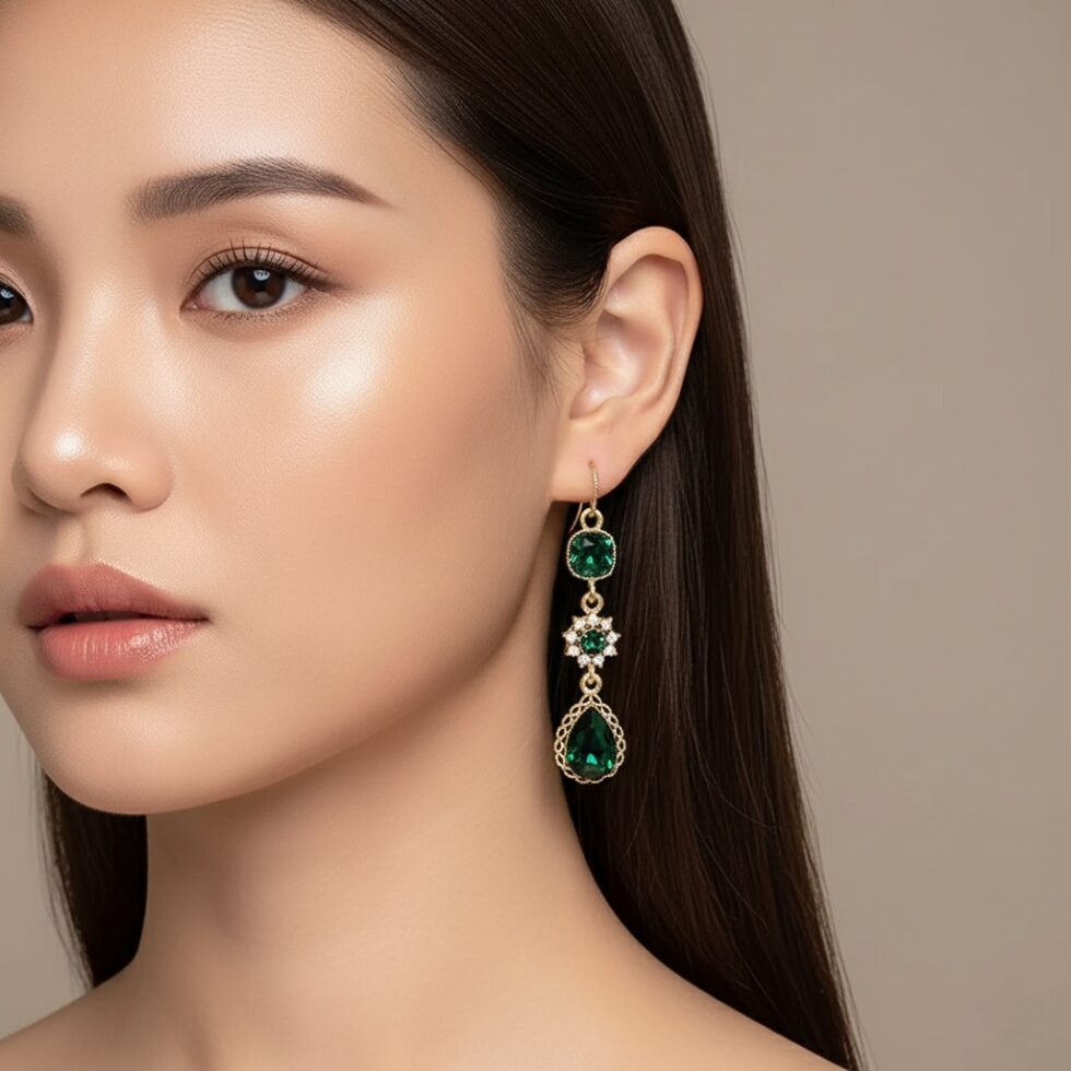Design: Triple-stone drop featuring a cohesive, ornate design with floral-like accents.