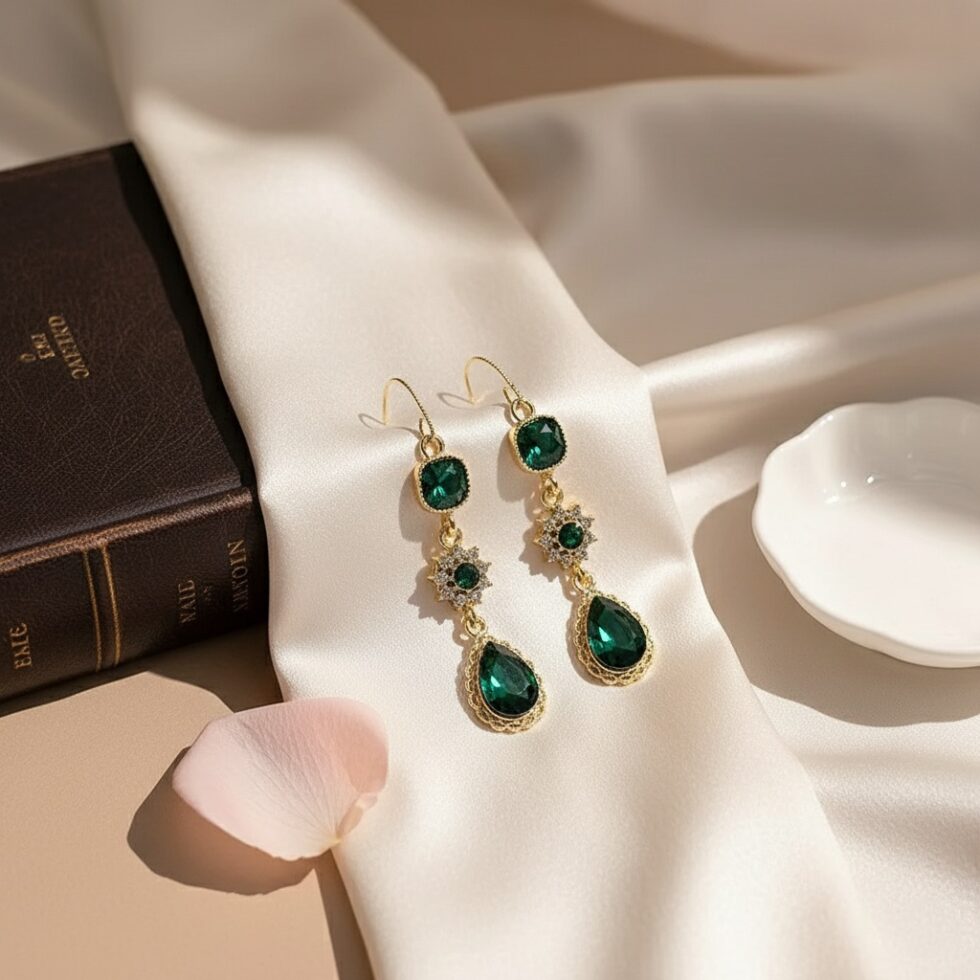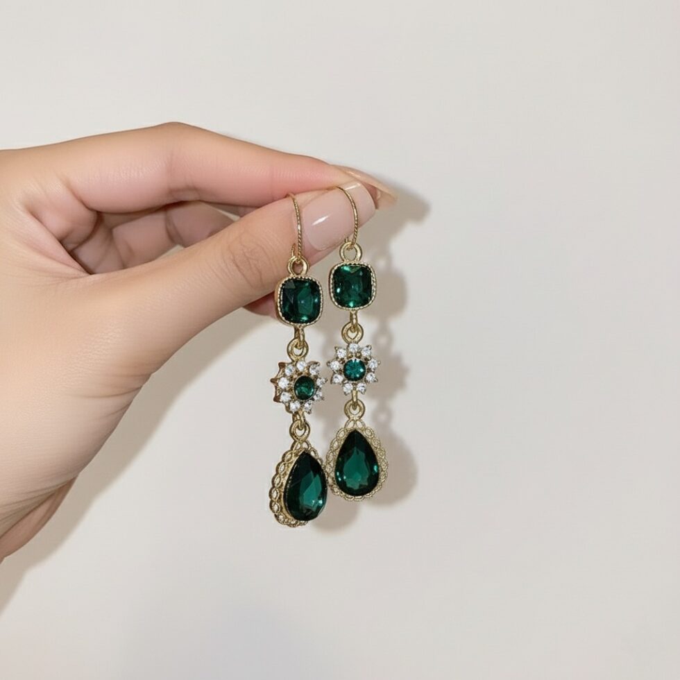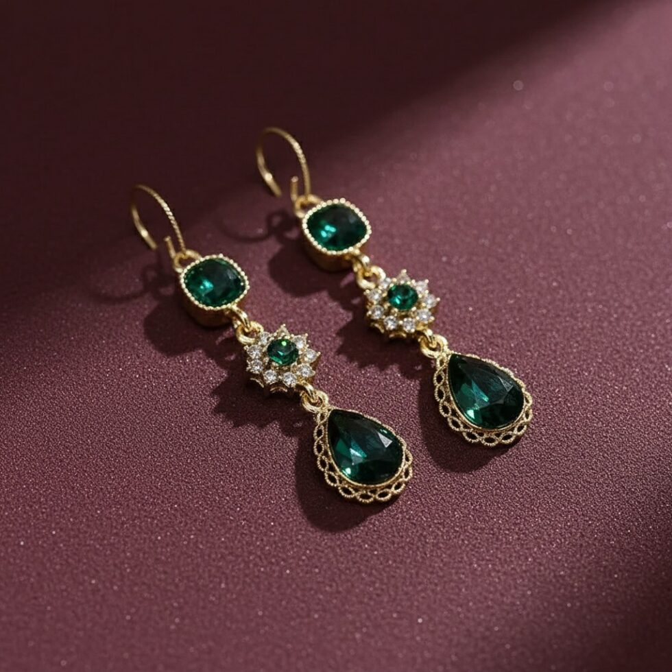 Dazzle with regal elegance! These Green Glimmer Drop Earrings feature a luxurious cascade of three distinct crystals—a square stud, a starburst centerpiece, and a brilliant teardrop—all set in a warm gold tone. The rich emerald, green hue provides instant, sophisticated glamour.