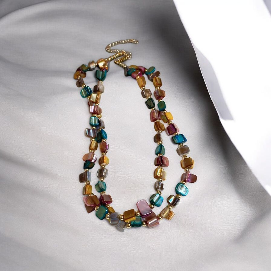 Add a vibrant burst of color with this stunning Iridescent Quad-Bead Layered Necklace. Featuring two pre-layered strands of small, iridescent mother-of-pearl beads in a dazzling mix of teal, pink, gold, and magenta. Perfect for resort wear or brightening up any outfit!