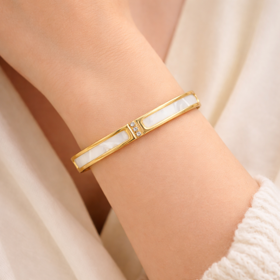 A sleek gold-tone bangle featuring smooth ivory inlay panels and delicate crystal accents at the center. Minimal, elegant, and perfect for effortless everyday wear or refined occasions.