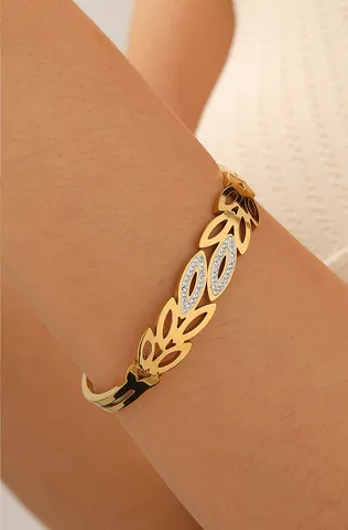 The Lioré Leafline Bangle features an elegant sequence of sculpted leaf motifs, highlighted with delicate crystal detailing for a soft touch of brilliance. Crafted in a high-polish gold finish, its fluid design wraps the wrist beautifully, balancing organic charm with modern sophistication. Perfect for everyday elegance or special occasions, this bangle adds a graceful glow to any look.