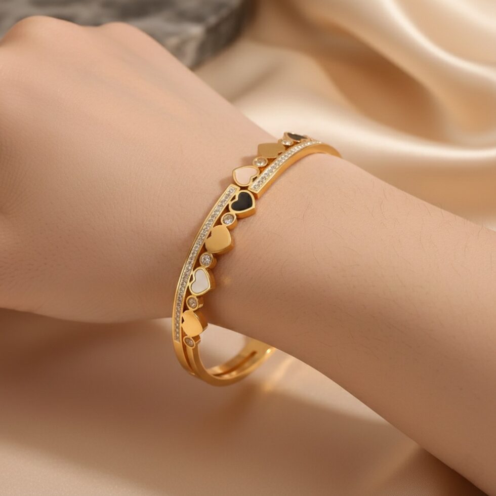 A graceful gold-tone bangle adorned with delicate heart motifs and shimmering stone accents, beautifully arranged along a softly curved band. Designed to symbolize love and elegance, this piece adds a refined romantic touch to both everyday wear and special occasions.