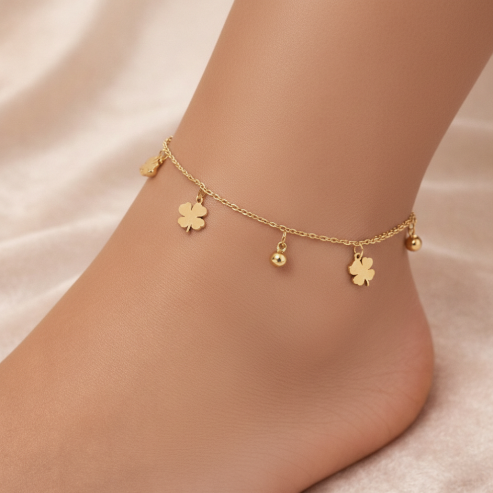 A delicate gold-tone anklet adorned with charming clover motifs and subtle bead accents, symbolizing luck and effortless elegance. Designed with a fine adjustable chain, this anklet adds a graceful shimmer to every step—perfect for everyday wear, holidays, and warm-weather styling.