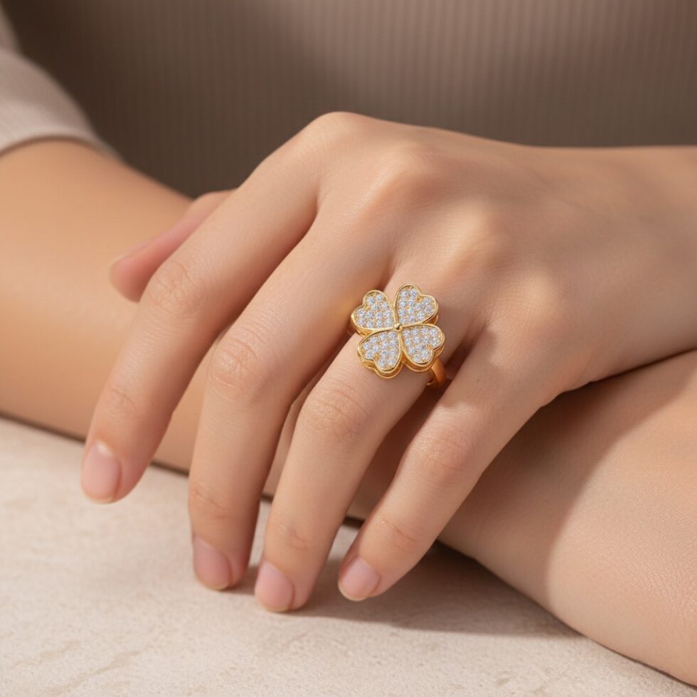 The Lumière Clover Spark Ring features a radiant four-petal clover design encrusted with shimmering crystal stones, symbolizing luck, beauty, and elegance. Finished in a rich gold polish, this statement ring catches the light beautifully from every angle, making it perfect for both everyday glamour and special occasions. A timeless piece designed to elevate your jewelry collection with effortless sophistication.