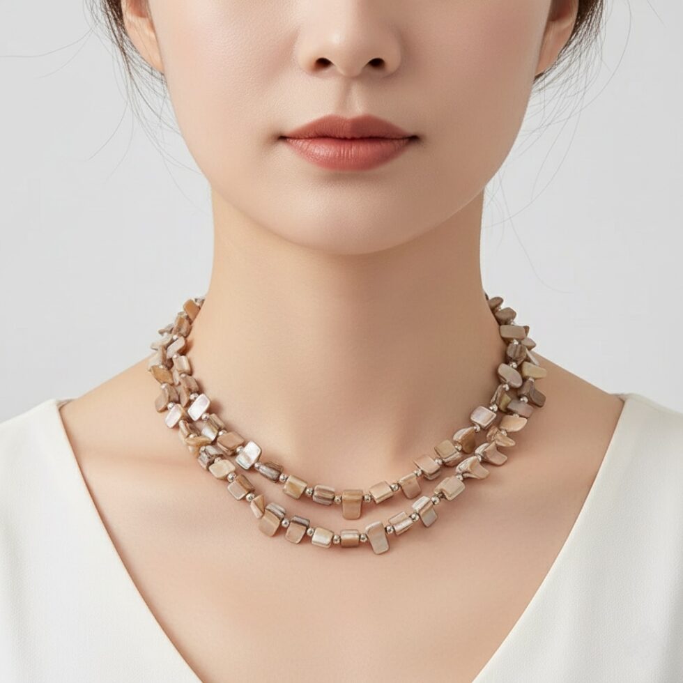 Embrace natural elegance with this Mother-of-Pearl Tile Layered Necklace. Two pre-layered strands feature flat, iridescent shell chips in warm taupe and cream tones, separated by tiny silver-tone beads. A simple yet chic accessory perfect for versatile, everyday wear.