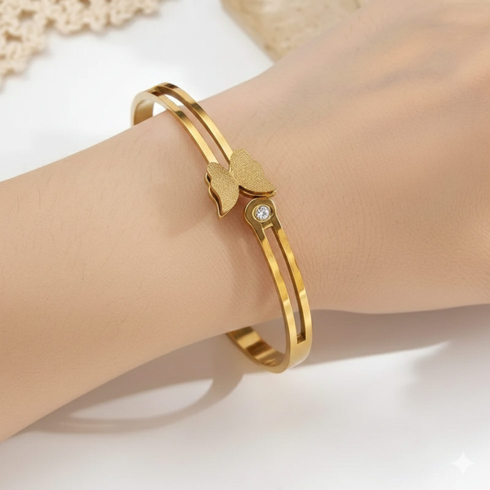 Graceful and feminine, the Nova Butterfly Spark Bangle features a sleek polished gold band accented with a delicately textured butterfly charm and a subtle crystal highlight. Designed for effortless everyday elegance, this lightweight bangle adds a soft sparkle and timeless charm to both casual and dressy looks.