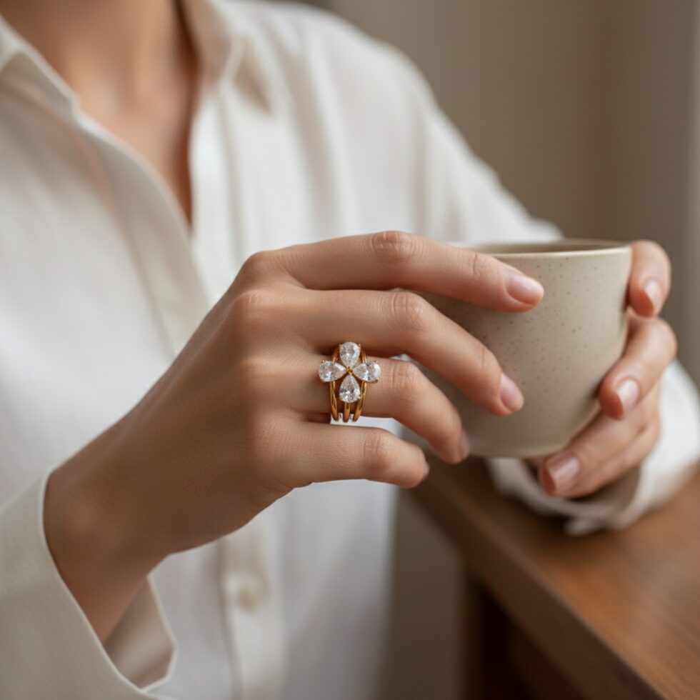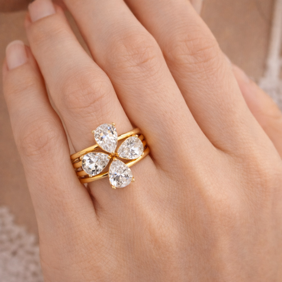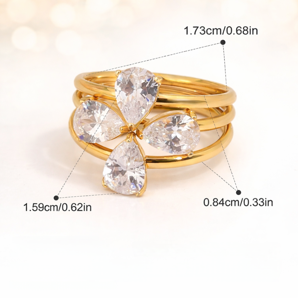 The Petaline Aura Ring features four radiant pear-cut crystals arranged in a sculptural bloom, creating a striking play of brilliance and depth. Set on a layered gold-finish band, the design offers a bold yet graceful silhouette that catches light beautifully from every angle. Crafted in waterproof, hypoallergenic stainless steel, this ring is made for comfortable everyday wear while delivering statement elegance.