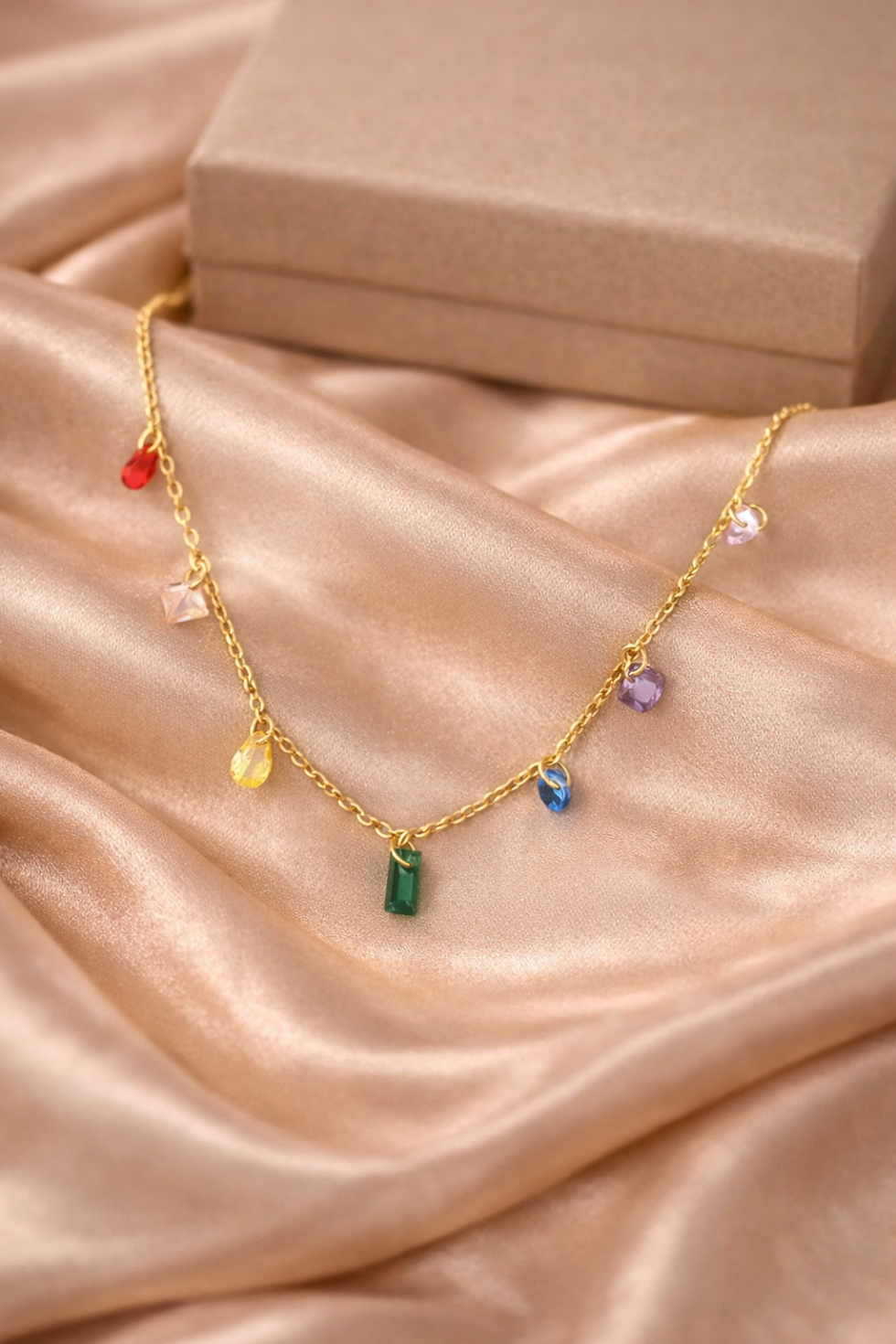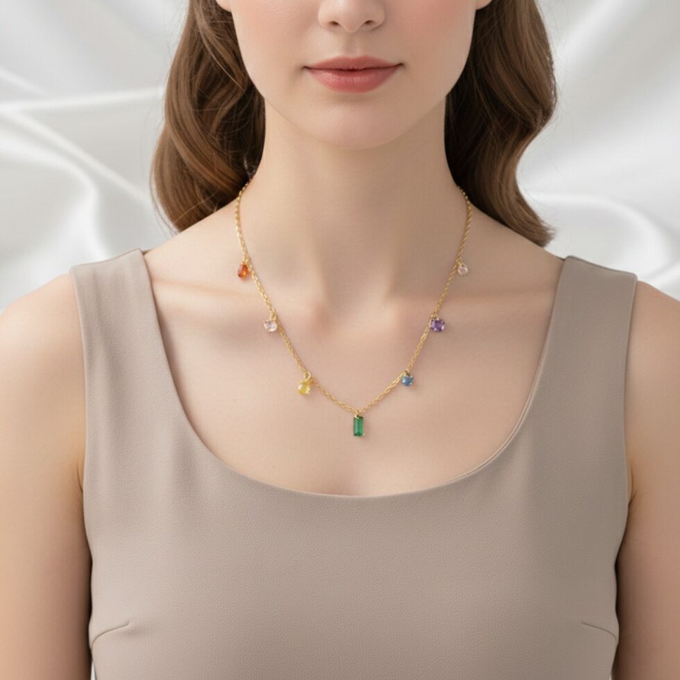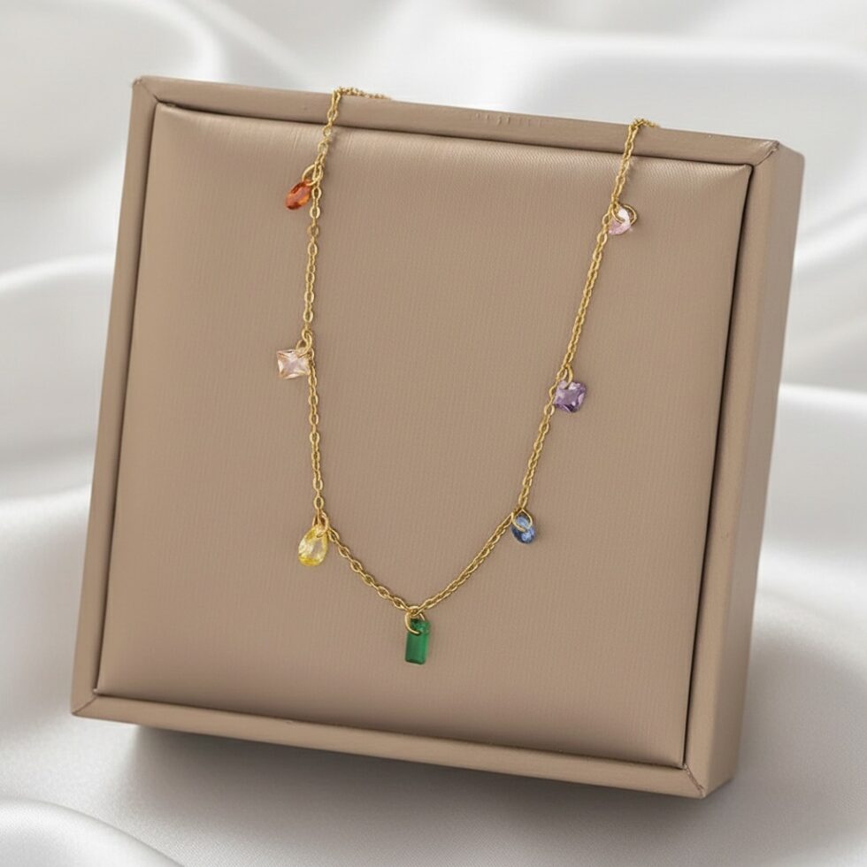 The Prism Whisper Necklace features a delicate gold-tone chain adorned with softly scattered multicolor crystal charms, finished with a subtle statement drop at the centre. Light, playful, and refined, this necklace adds a touch of color and effortless elegance—perfect for everyday wear or gentle layering.