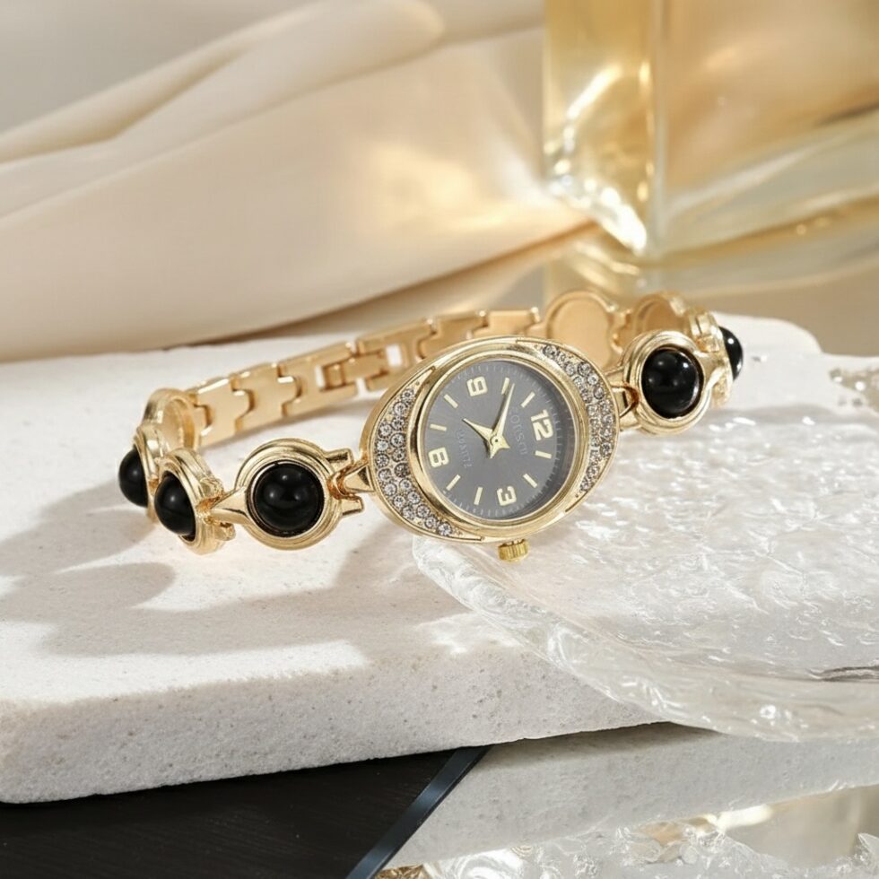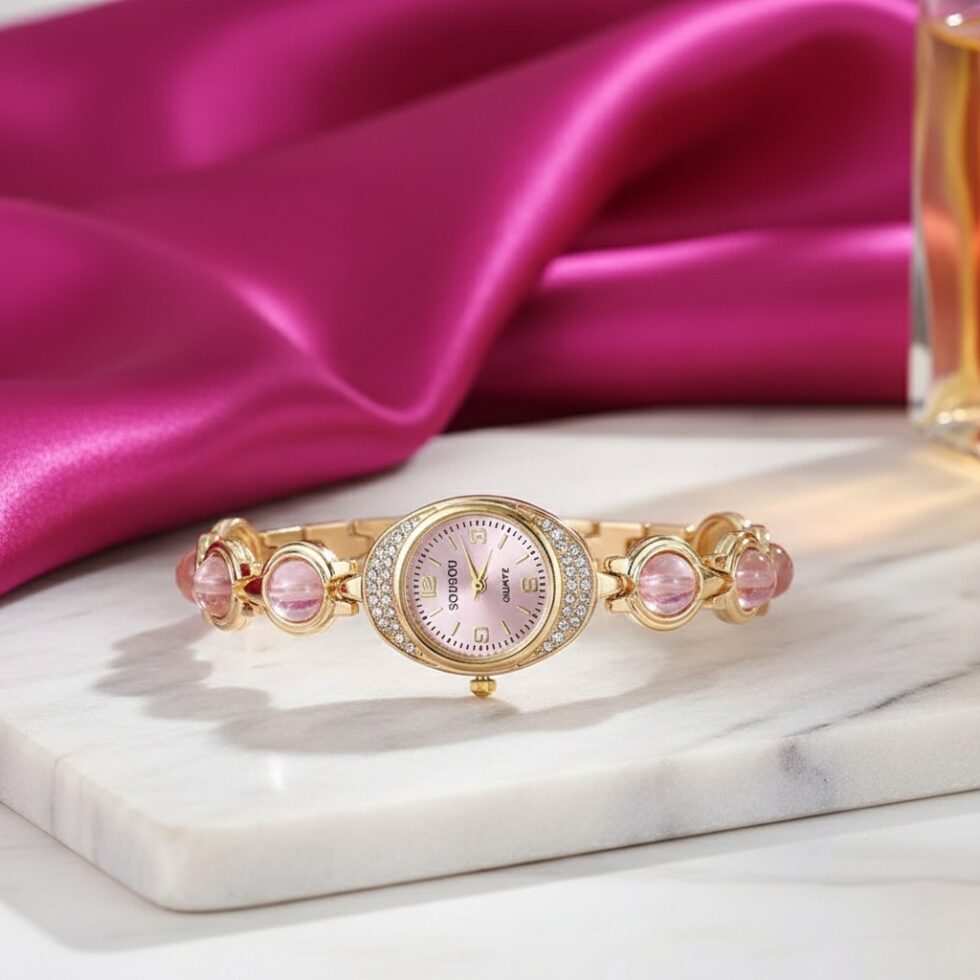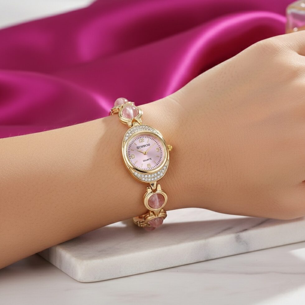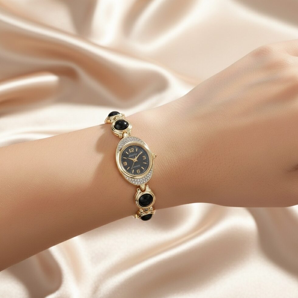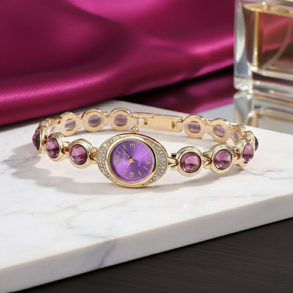 The Radiant Aura Watch Collection celebrates feminine charm through luminous gemstone bracelets paired with sparkling crystal bezels. Designed for women who love subtle luxury with statement appeal, these watches transition beautifully from day to evening wear.