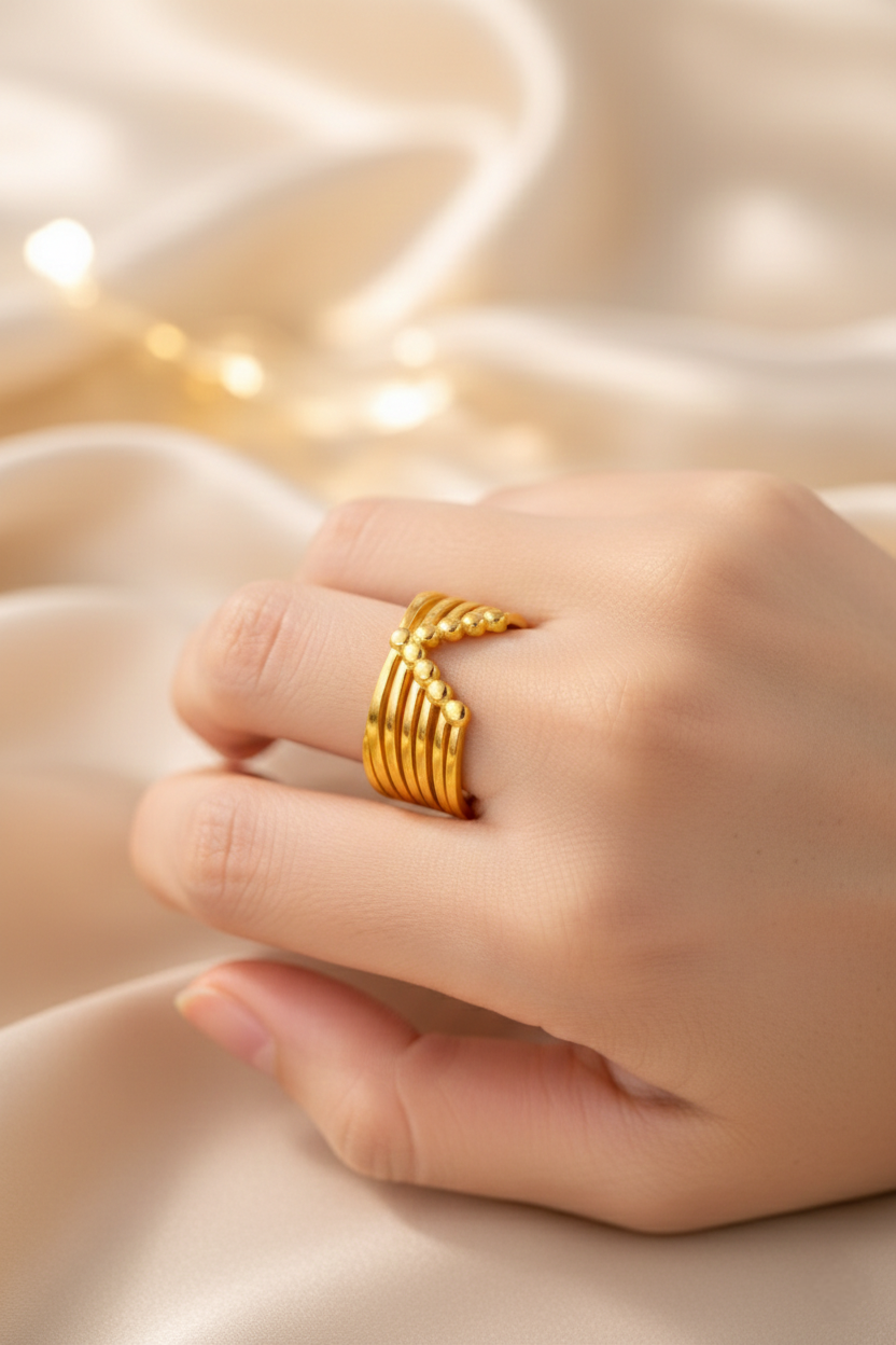 A striking gold-tone ring designed with layered bands and polished bead accents that create a bold yet refined silhouette. Contemporary and eye-catching, this adjustable statement piece adds confident elegance to both everyday outfits and evening looks.