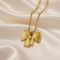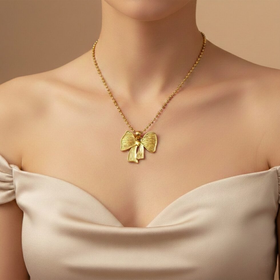 The Seraphine Bow Pendant Necklace features a beautifully textured gold bow design that blends femininity with modern elegance. Hanging from a classic gold beaded chain, the sculpted details add depth and character, making it a standout piece for everyday wear or special occasions. A graceful symbol of charm and confidence, this necklace elevates any outfit effortlessly.