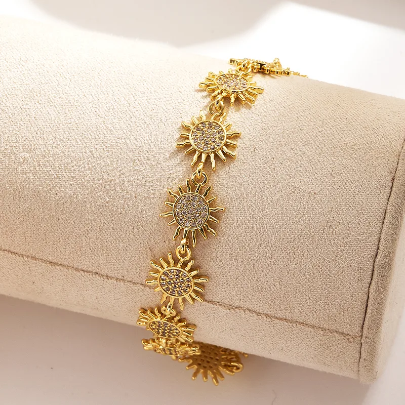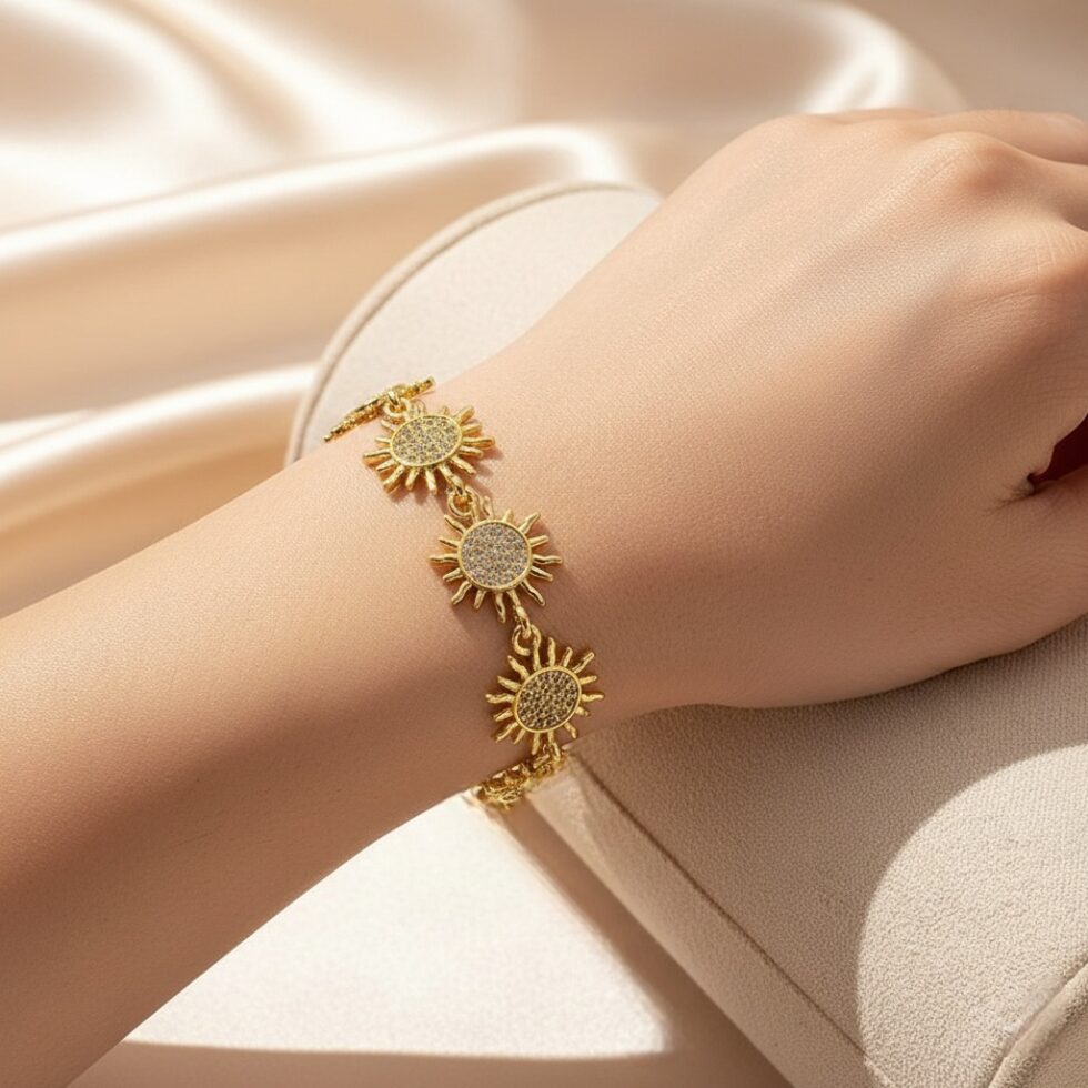 The Solarya Radiant Bracelet features a sequence of sun-inspired medallions, each detailed with shimmering crystal accents that capture light beautifully. Linked together in a flowing gold design, this bracelet creates a striking statement while maintaining a refined, elegant feel. Perfect for festive occasions or elevating everyday outfits, it brings warmth, brilliance, and confidence to every look.