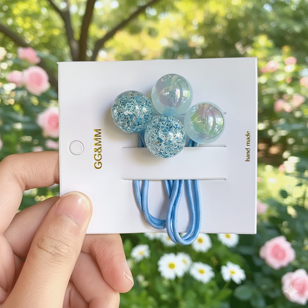 This is a set of contemporary and playful hair accessories consisting of small, elastic hair ties. Each tie is adorned with a cluster of round, spherical beads or balls made from resin or acrylic. The most distinct feature is the mix of finishes: some balls are clear and iridescent (like a soap bubble), and others are opaque and heavily embedded with glitter, creating a sparkling, “snow globe” effect. They are typically sold as a set of two hair ties.