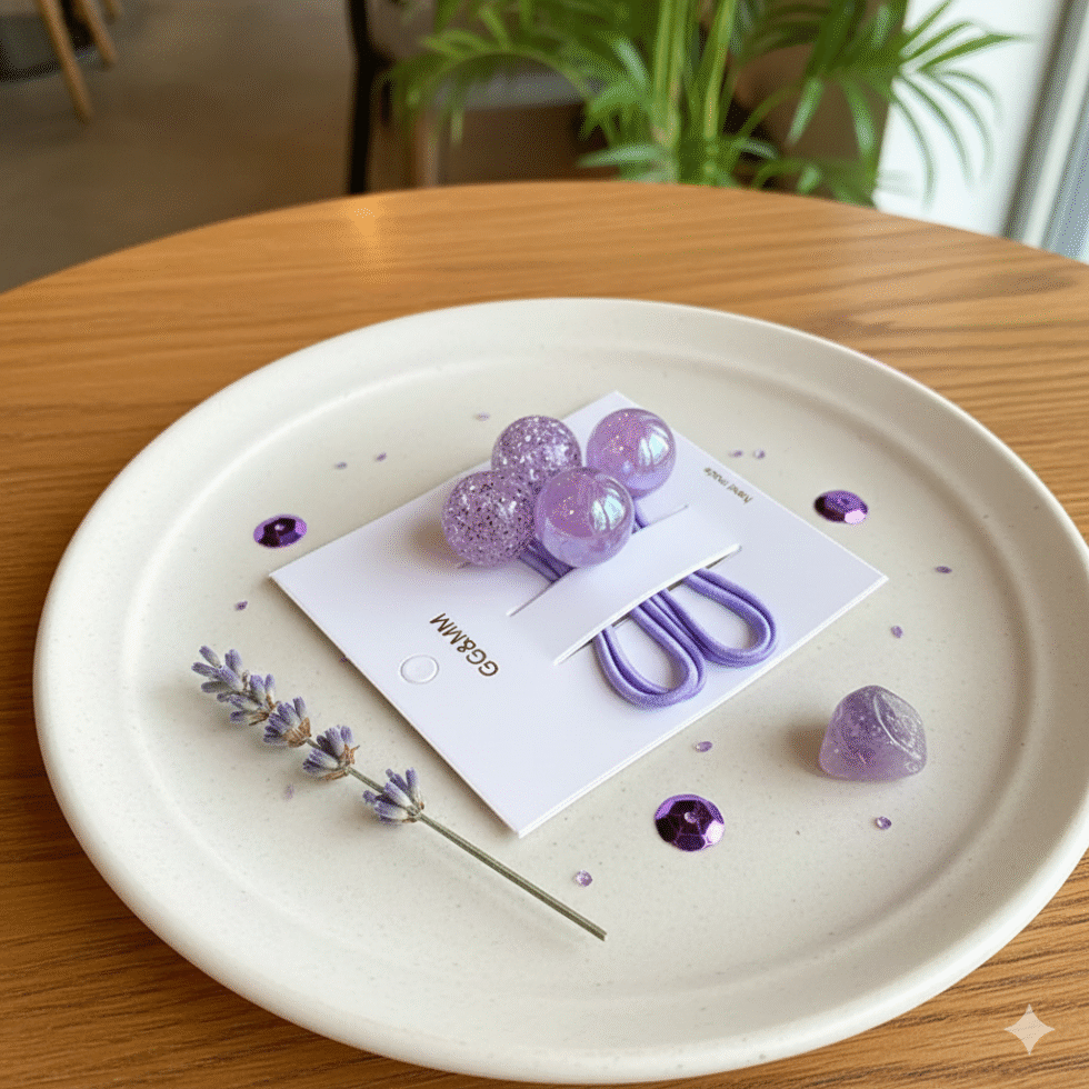 Material (Band): Elastic/Rubber Hair Tie. The band is typically a thin, looped elastic cord, usually matched to the main color of the decorative balls (e.g., light blue with blue balls, purple with purple balls, hot pink with pink balls).
