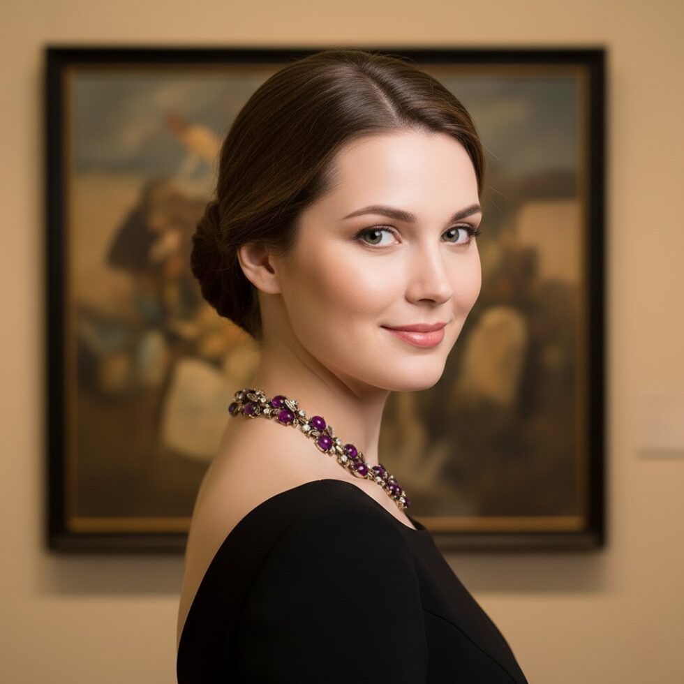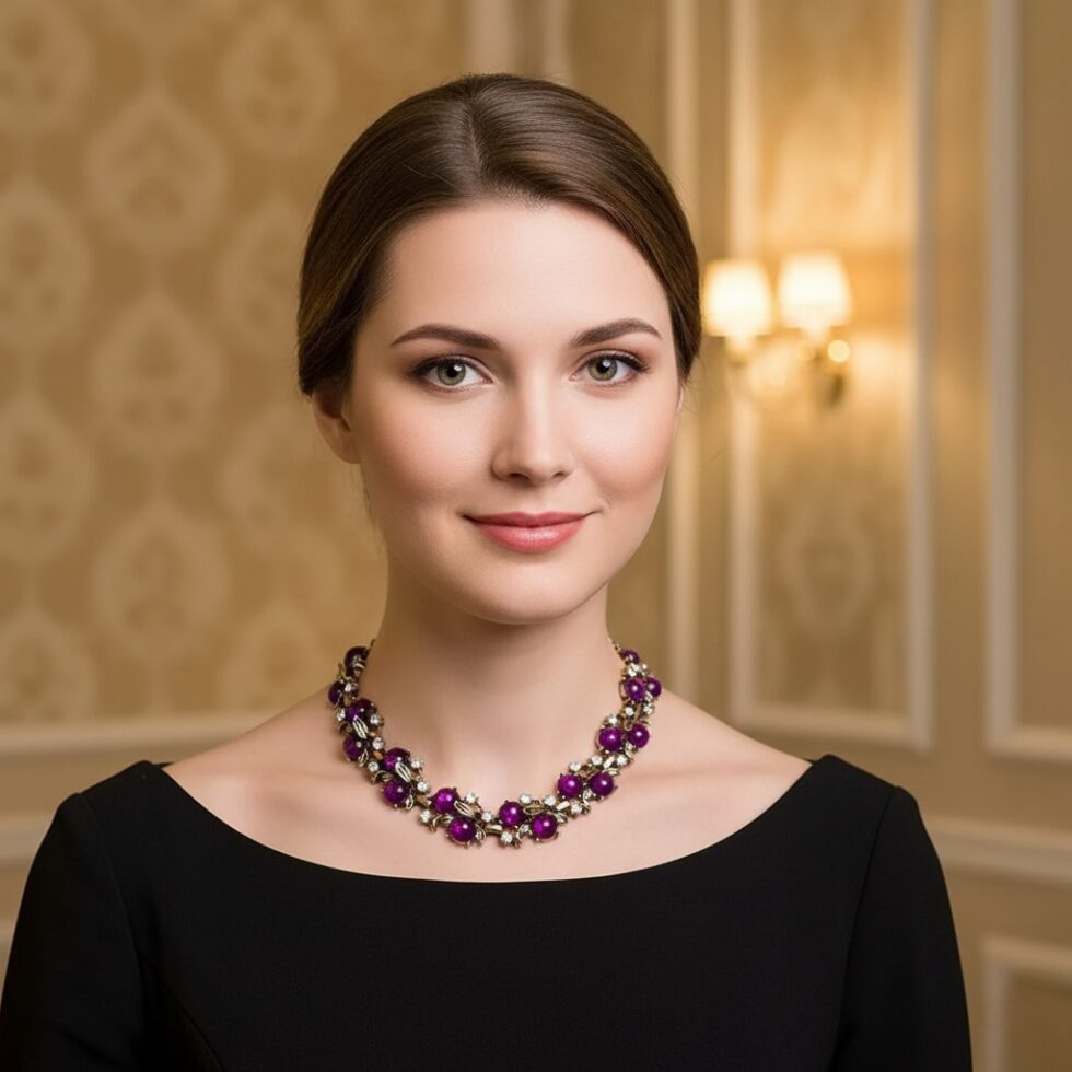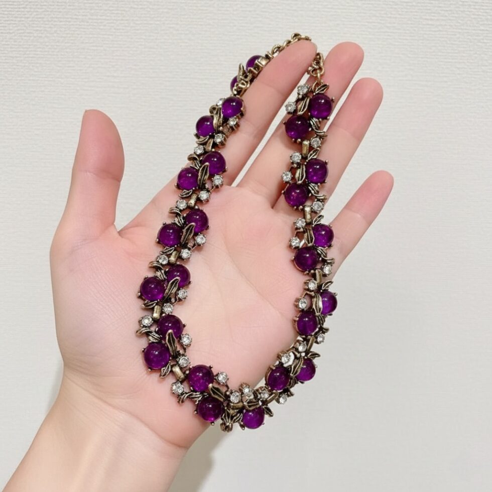 Make a grand, opulent statement with The Amethyst Vine Collar, a luxurious necklace inspired by vintage costume jewelry. This intricate piece features a continuous cascade of polished, deep purple cabochon stones (reminiscent of grapes or amethyst beads) linked by ornate antique gold-toned metalwork. Small clusters of shimmering clear crystals are nestled between the purple stones, adding a delicate, vine-like sparkle. Sitting perfectly at the collarbone, this necklace is an ideal anchor for formal events, holiday gatherings, or adding a rich, regal touch to any sophisticated ensemble.