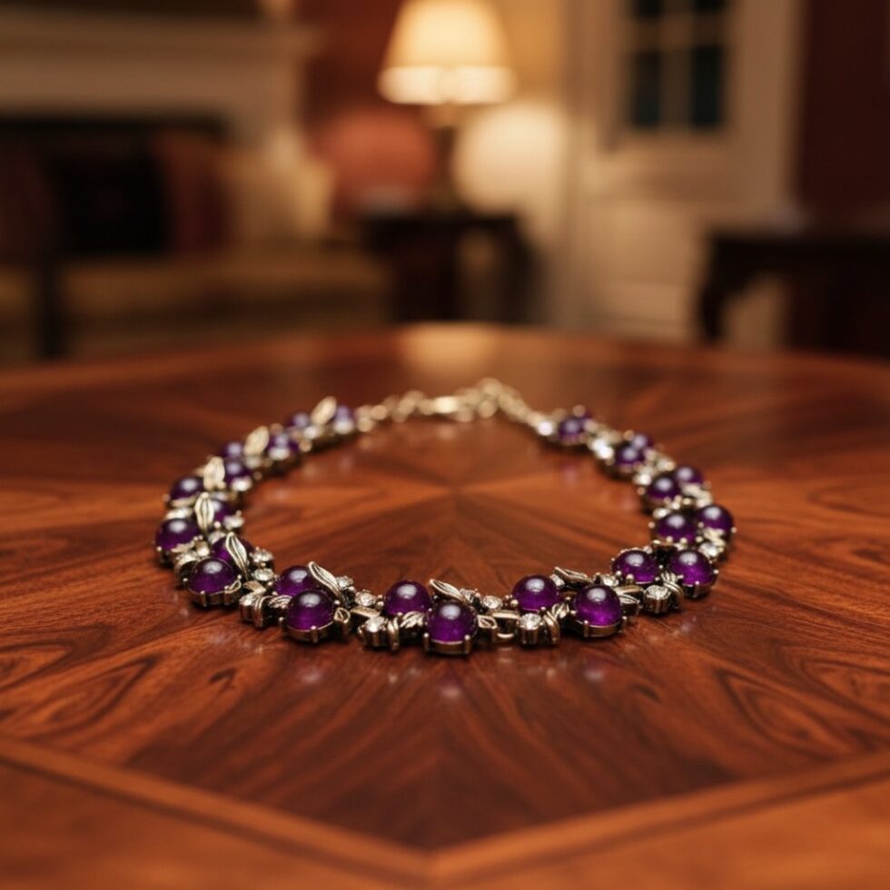 Design: Continuous row of large purple cabochons linked by crystal-accented antique metal foliage.