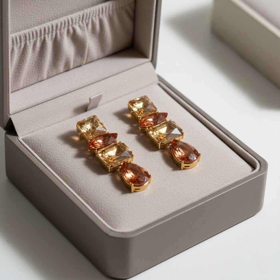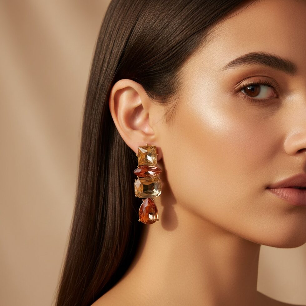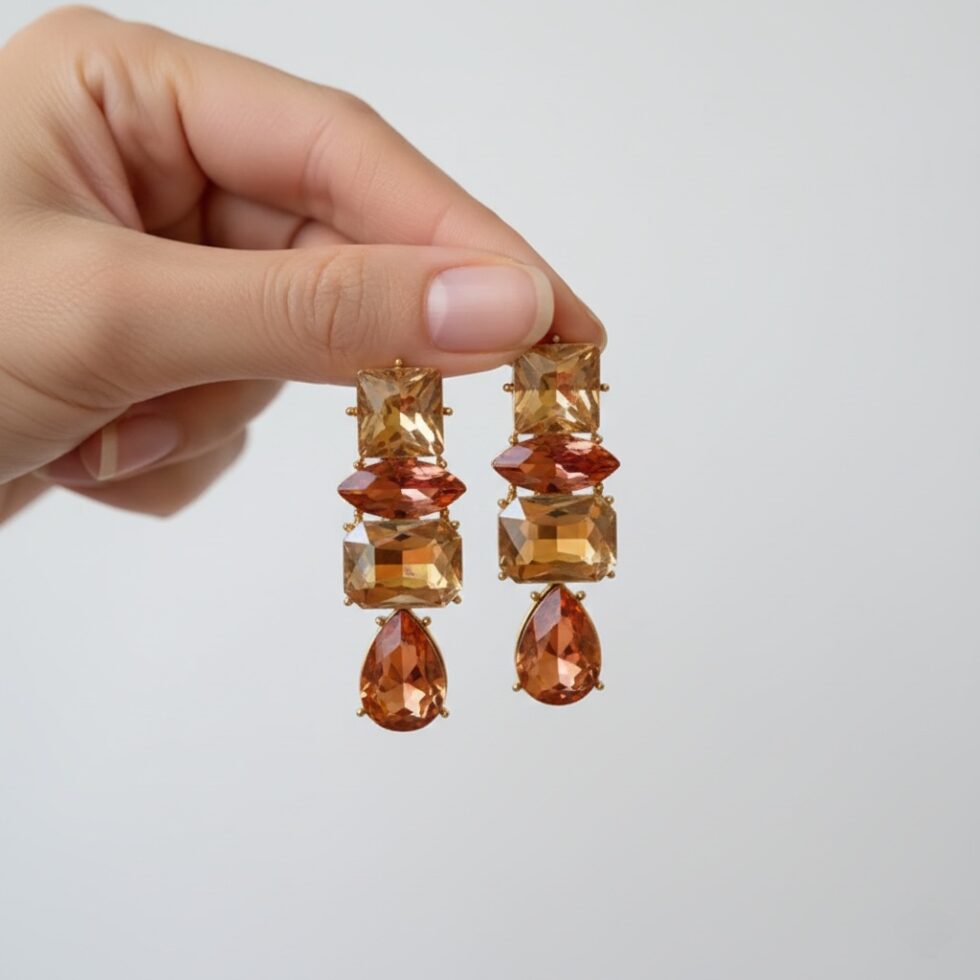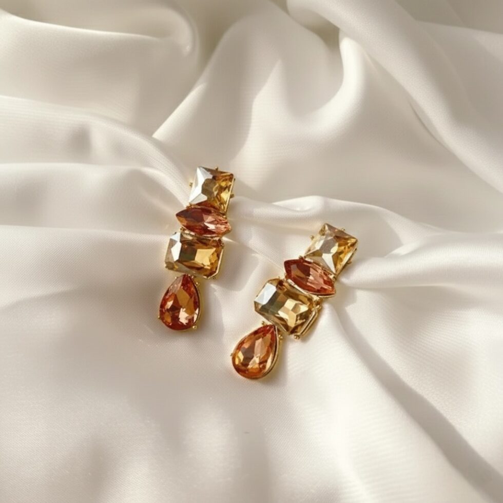 Capture the rich, warm luminosity of autumn with The Autumn Glow Linear Drops. These stunning earrings feature a vertical arrangement of four connected, multifaceted simulated crystals in a luxurious palette of amber, citrine yellow, and deep burnt orange. The combination of geometric cuts—including a square, a rectangle, and a dazzling pear-shaped drop—creates a sophisticated, waterfall effect. Set in polished gold-toned metal, these earrings are perfect for adding a touch of golden warmth and brilliant shine to holiday events, fall fashion, or chic evening wear.