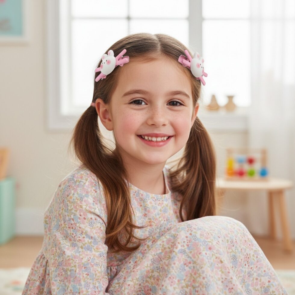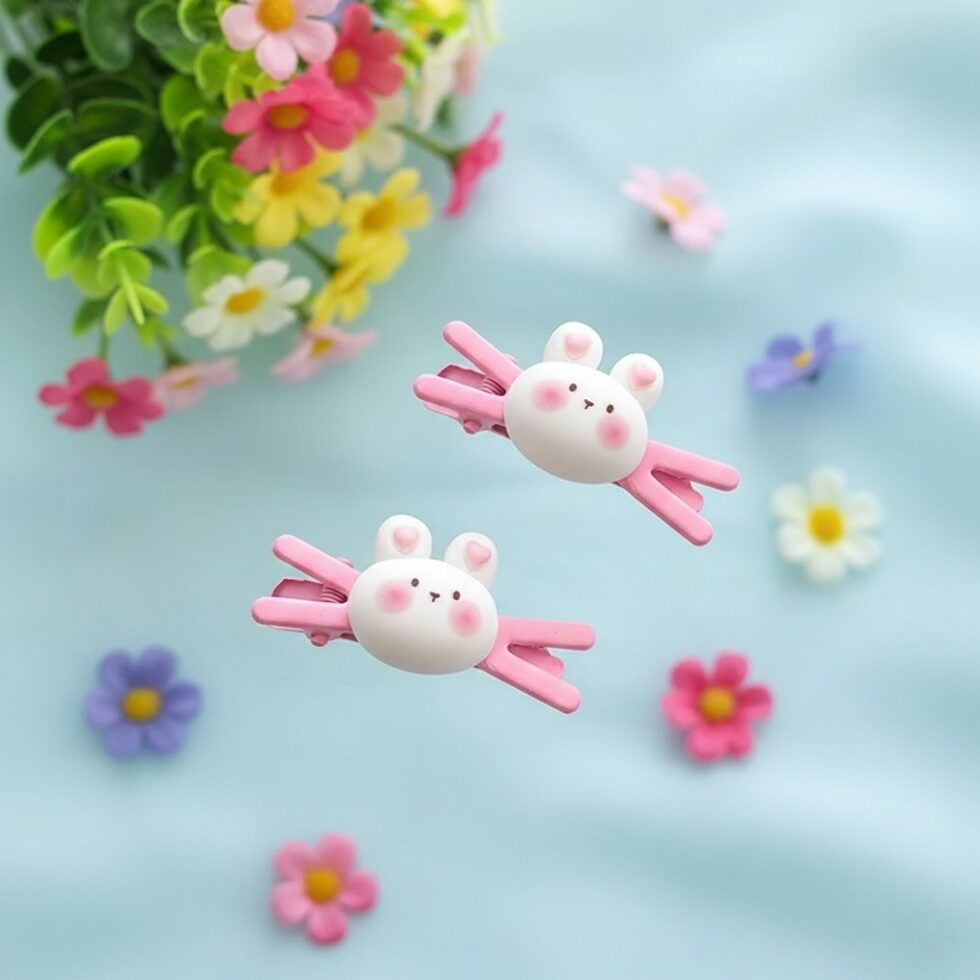 Bring a delightful touch of springtime cuteness to your hairstyle with The Baby Bunny Snap Clips. This adorable matching pair features a stylized bunny or rabbit head charm with sweet facial features (pink cheeks, tiny nose, small ears), crafted in soft, opaque pink and white resin. The charm is securely mounted onto a pink-toned snap clip base. These charming, lightweight clips are perfect for securing small sections of hair, adding a whimsical accent to braids or ponytails, or complementing a cute, “kawaii” aesthetic, making them ideal for young wearers or those who love playful, animal-themed accessories.