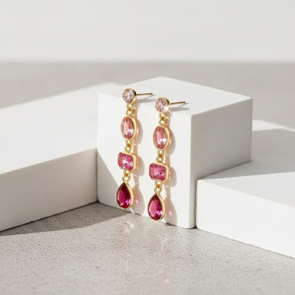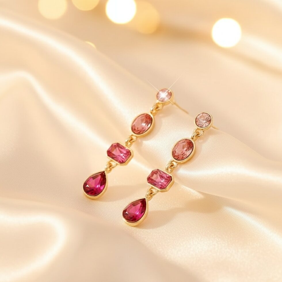 Radiate soft, feminine glamour with The Blush Gem Cascade Earrings. These elegant linear drops feature a trio of connected, graduating simulated crystals in a delicate, romantic spectrum of pinks. The stones progress from a clear/light pink oval top, to a vivid magenta emerald-cut rectangle, and finally, a deep ruby teardrop pendant. Each crystal is individually set in polished gold-toned bezels. These sophisticated earrings are perfect for adding a luxurious, monochromatic pop of color to weddings, romantic evenings, or holiday celebrations.