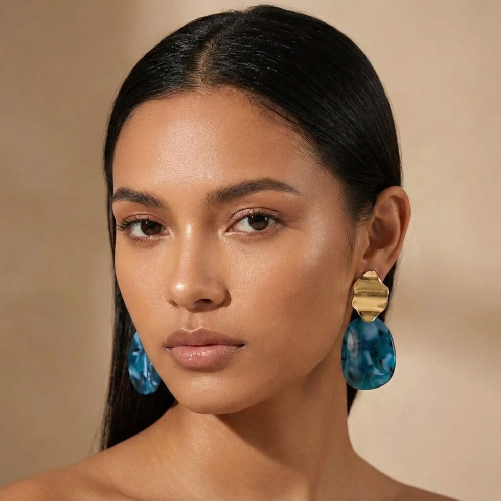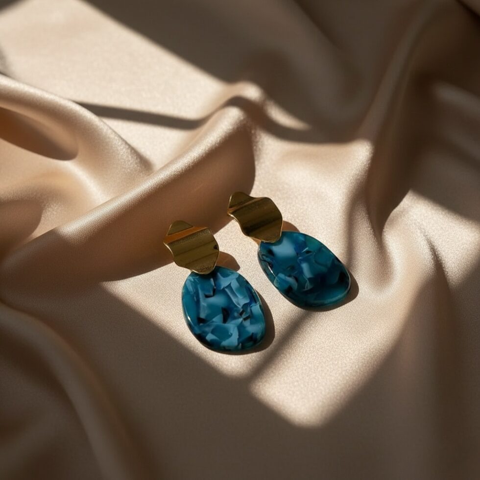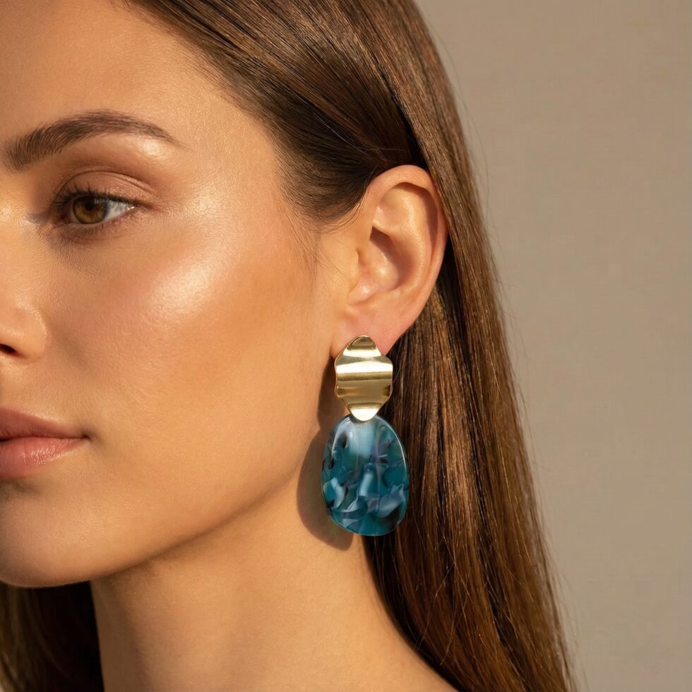 Make a bold, contemporary statement with The Cerulean Current Drops. These striking dangle earrings feature a two-tiered design combining polished metal with vibrant resin. They begin with a small, highly polished gold-toned geometric top piece that connects to a large, flat, asymmetrical oval charm. The charm is made of glossy resin in a mesmerizing, marbled pattern of deep blues, lighter cerulean, and black, giving it the appearance of swirling ocean currents or a deep agate stone. The clean lines of the gold top and the organic shape of the marbled resin create a sophisticated, architectural, and colorful accessory perfect for daytime chic, resort wear, or adding a modern pop of color to any look.