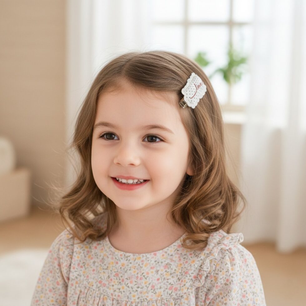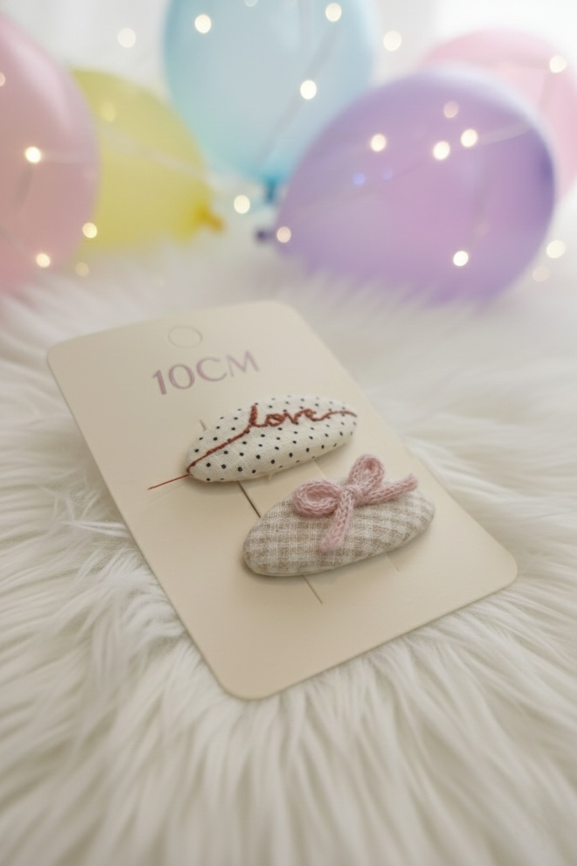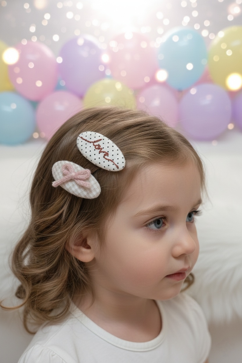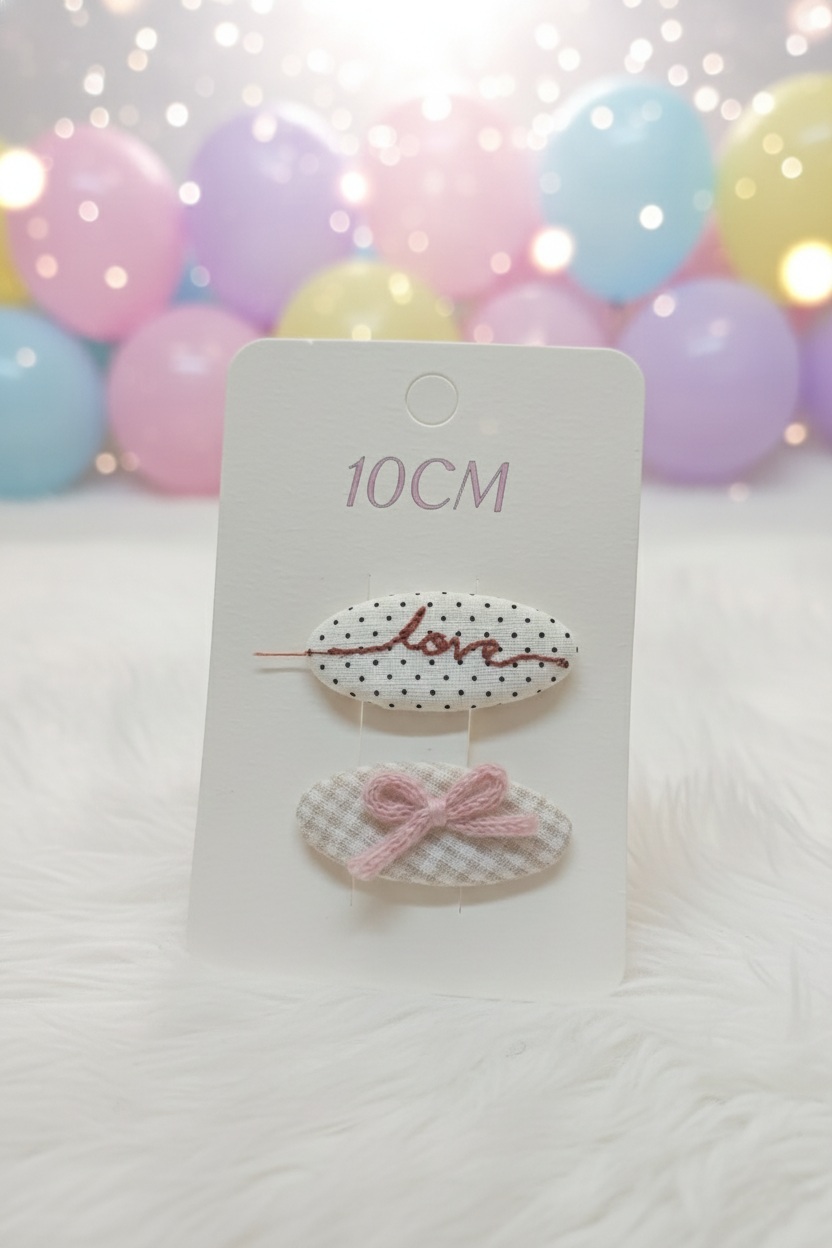 Design: Two oval snap clips covered in contrasting patterned fabrics, one with embroidered text, and the other with a small knit bow.