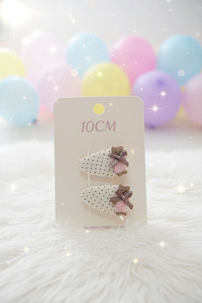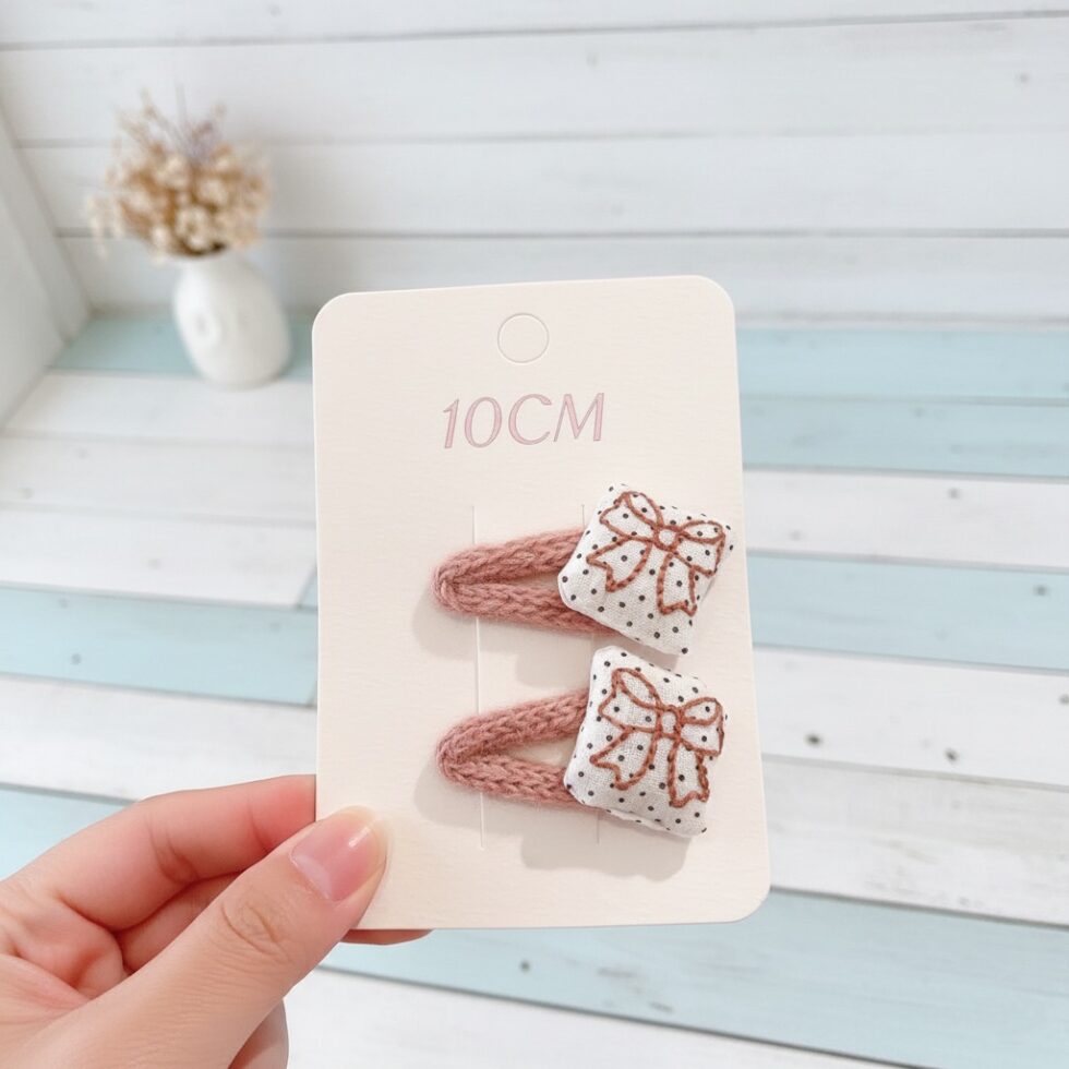 Material: Fabric (Polka Dot and Gingham/Check), Embroidery Thread, Knit Yarn/Ribbon (for the bow), and Metal (for the clip mechanism).