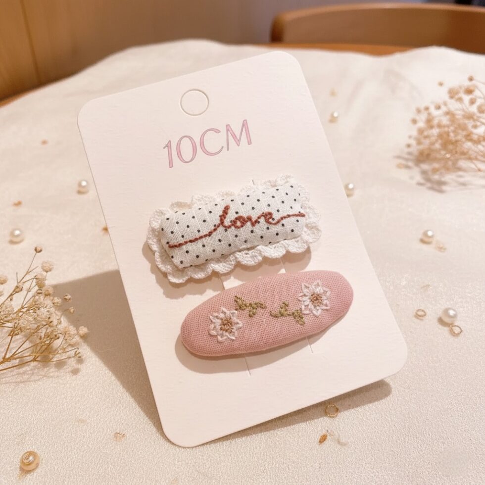 Add a soft, handcrafted, and romantic touch to your hairstyle with The Cottagecore Textural Snap Clips. This matching pair of elongated, oval-shaped snap clips features a charming mix of soft fabrics and needlework. One clip is covered in a white fabric with small polka dots and features embroidered script that says “love” in a contrasting color. The second clip is covered in a pink-and-white gingham or check fabric and features a delicate, pink knit bow appliqué. The blend of textures and sweet, homemade aesthetic makes this set perfect for adding a dainty, whimsical, and cozy accent to everyday casual wear or bohemian outfits.