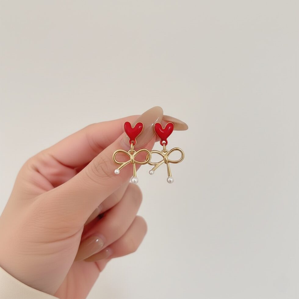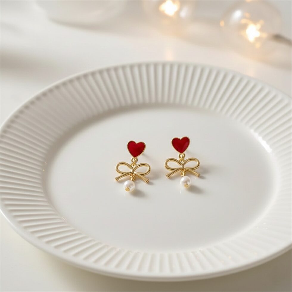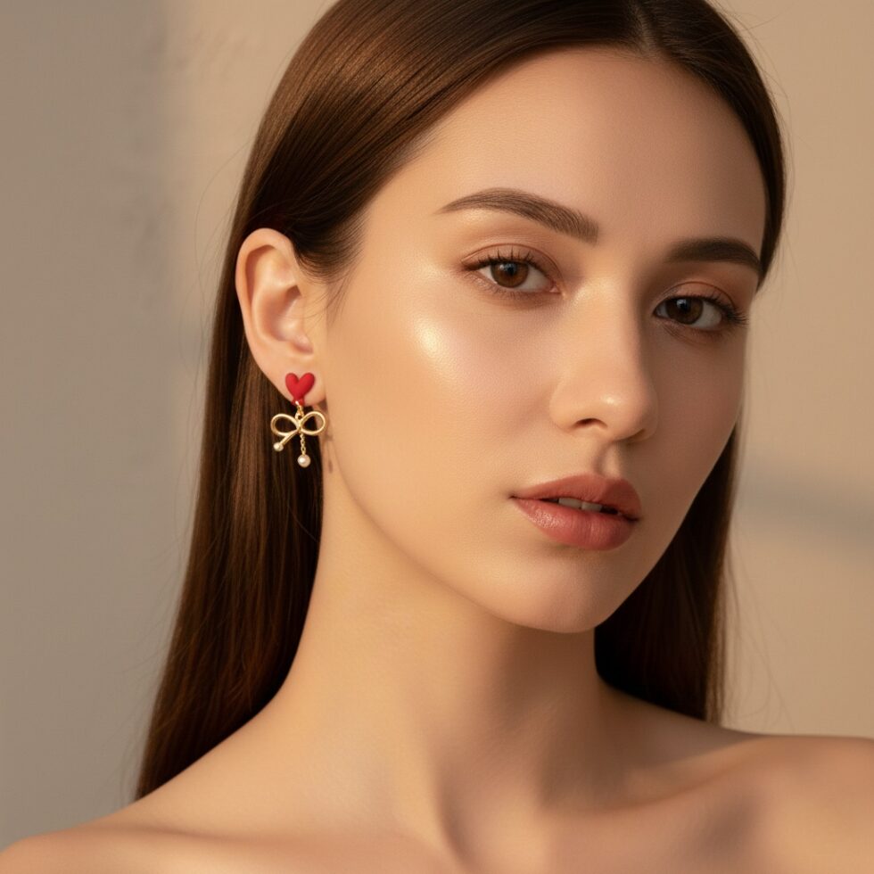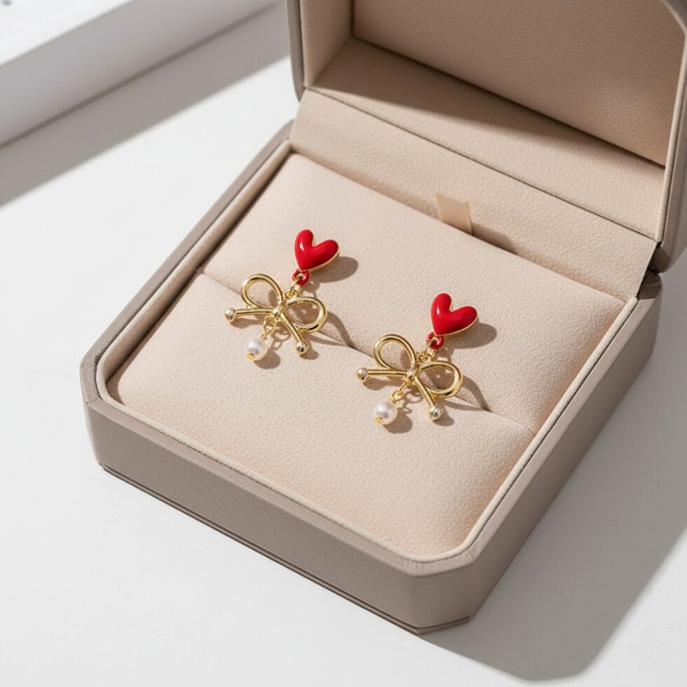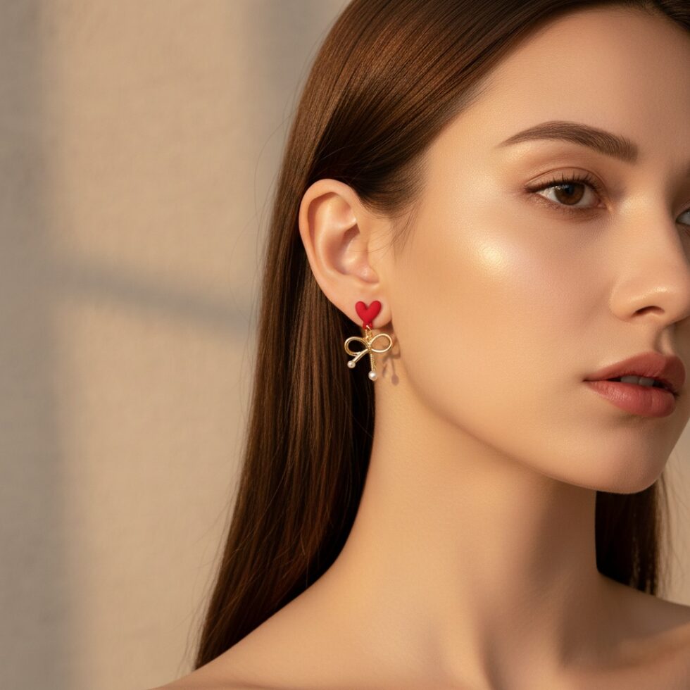 Add a sweet, romantic touch to your look with The Cupid’s Bow Drops. These dainty and feminine earrings feature a glossy, opaque red heart stud connected to a whimsical gold-toned bow charm. A single luminous faux pearl is suspended from the bottom of the bow, adding a perfect, elegant finish. These lightweight and charming earrings are ideal for romantic dates, expressing a playful feminine style, or adding a festive touch for holidays like Valentine’s Day.