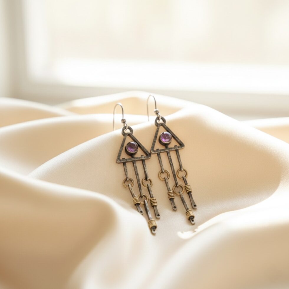 Embrace a handcrafted, earthy elegance with The Desert Fringe Dangles. These unique earrings feature a geometric, open-frame triangle set in oxidized, textured sterling silver, cradling a single deep purple (amethyst-toned) cabochon stone. Suspended beneath are three delicate fringes made of hammered silver bars accented with contrasting brass or gold-toned wire wraps and rings. The mix of metals and rustic detailing gives these earrings a strong Southwestern or tribal-modern aesthetic, perfect for everyday artistic wear and bohemian styling.