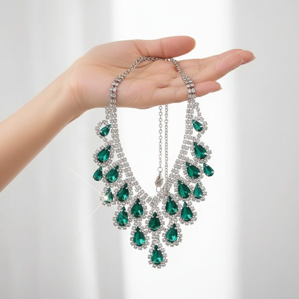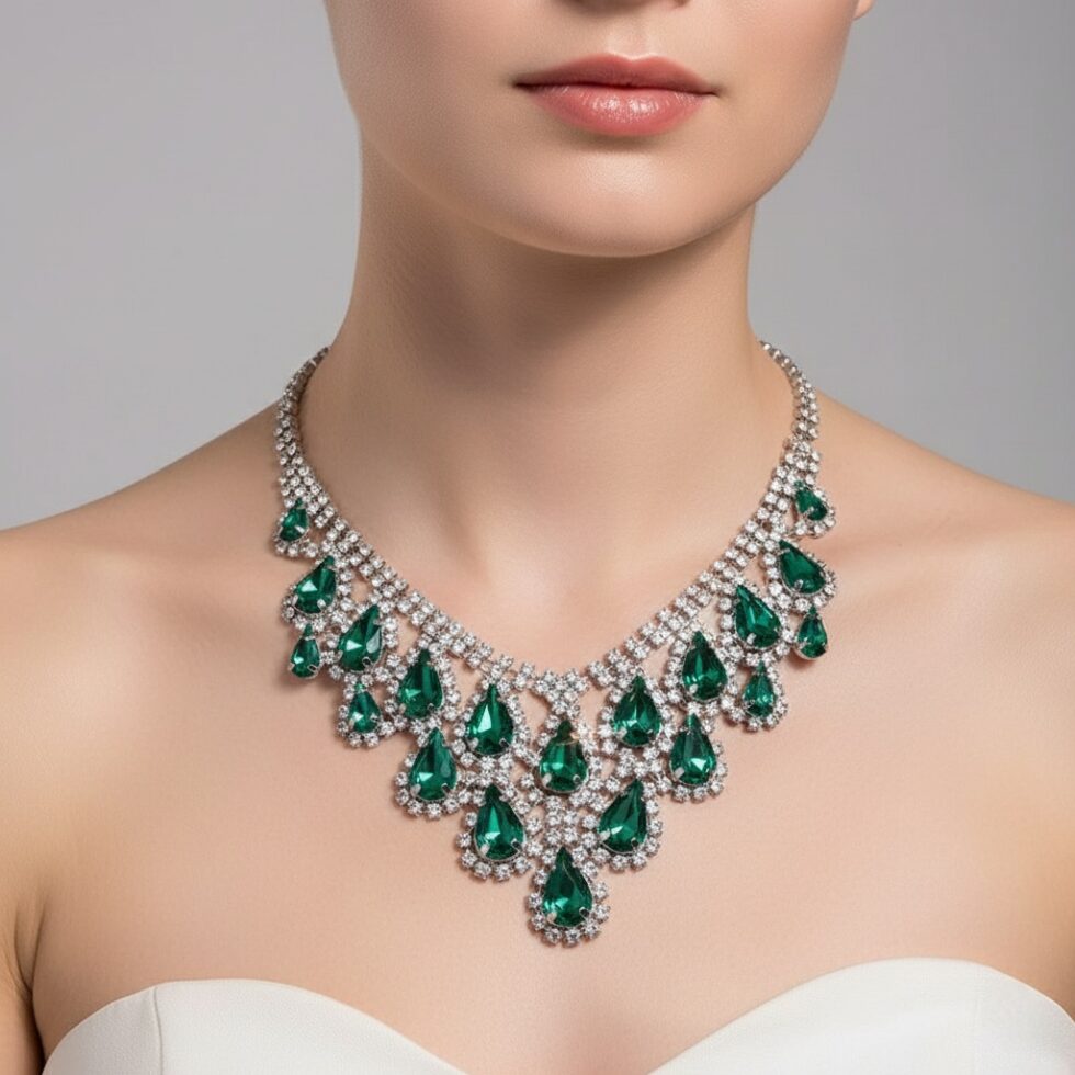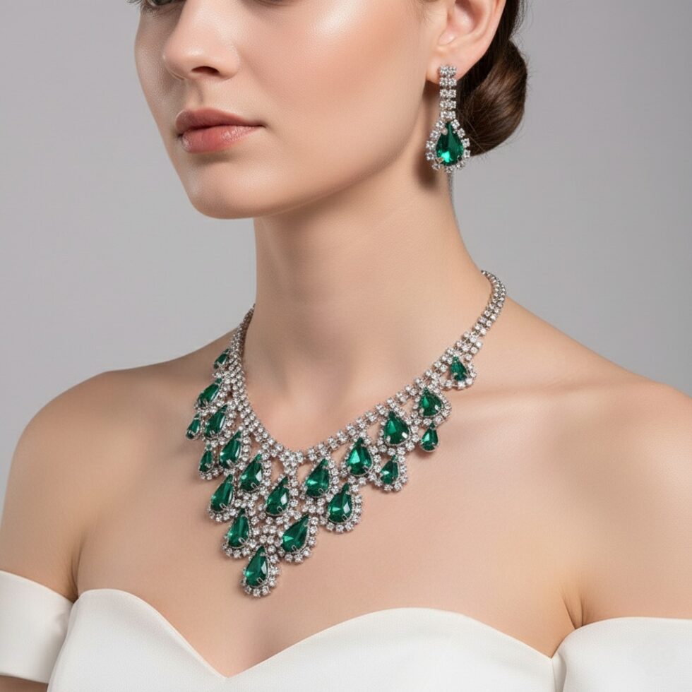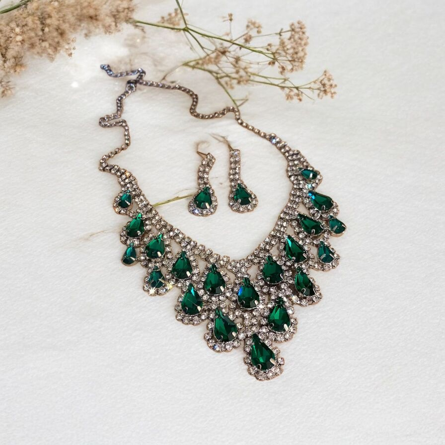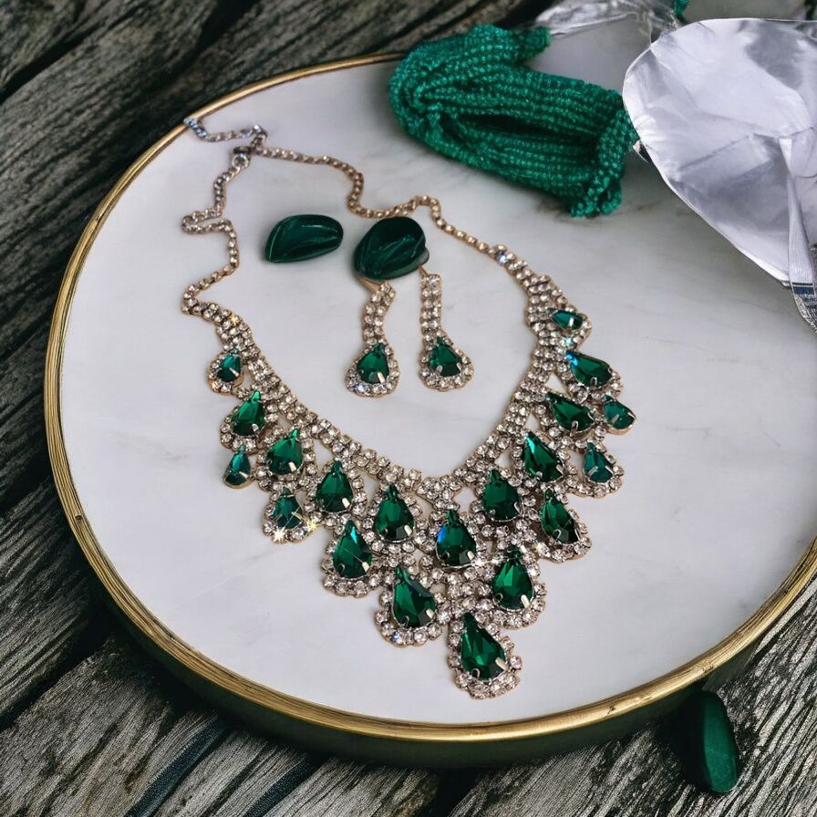 Drench yourself in dazzling drama with the Emerald Regent Set. A spectacular cascade of deep emerald green teardrop crystals is framed by brilliant, clear pavé stones, creating a show-stopping sparkle. This necklace is the ultimate accessory for galas, weddings, and formal events.
