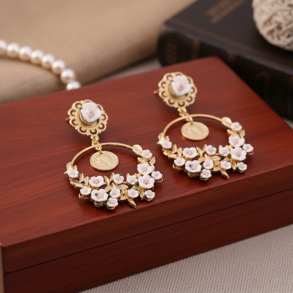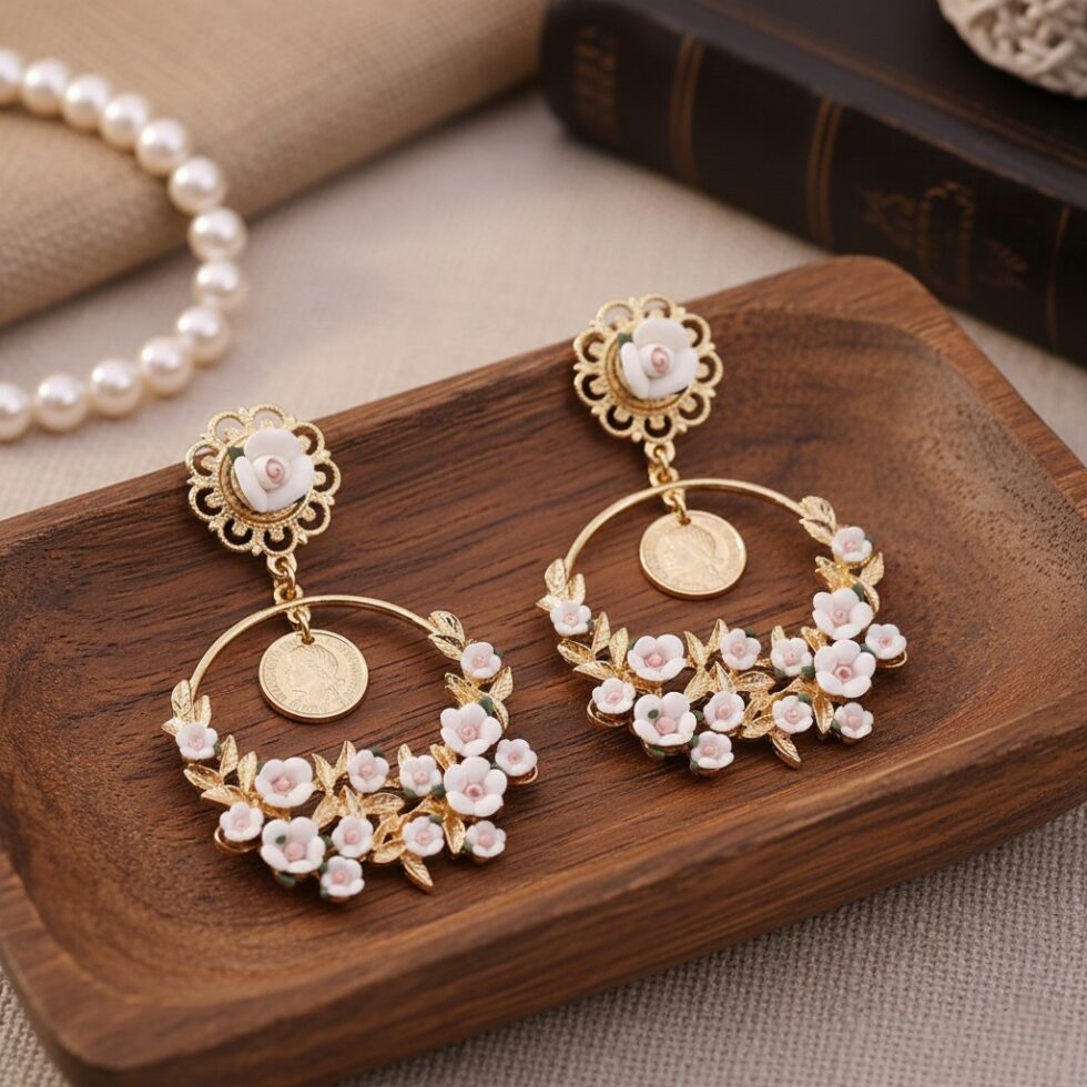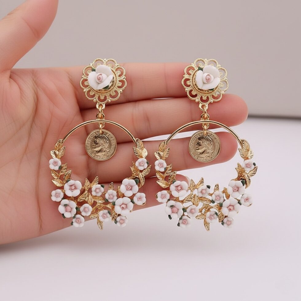 Embrace a blend of classic romance and whimsical artistry with The Eternal Bloom Coin Drops. These stunning statement hoops feature a cluster of delicate, hand-painted white and soft pink ceramic or enameled flowers nestled amongst golden leaves, forming a charming wreath around the bottom half of the hoop. The earrings dangle from an ornate filigree stud top with a central flower, and a detailed gold-toned coin-like charm is suspended inside the hoop, adding a vintage, regal touch. These are the perfect accessory for garden parties, summer weddings, or adding a sophisticated, fairy-tale accent to your ensemble