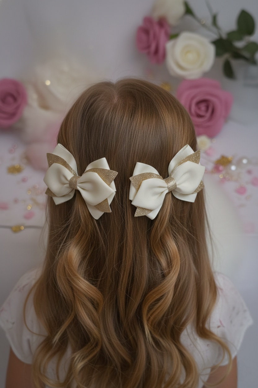 Material: Grosgrain or Satin Ribbon (Ivory/White), Glitter Ribbon/Fabric, and Metal (for the clip mechanism).
