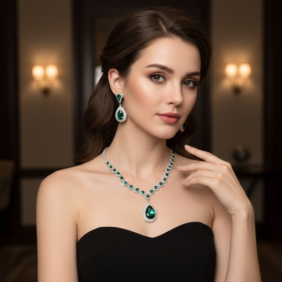 Material: Simulated Crystals (Cubic Zirconia/Glass), Simulated Emerald Stones (Glass/Resin), and Base Metal Alloy.