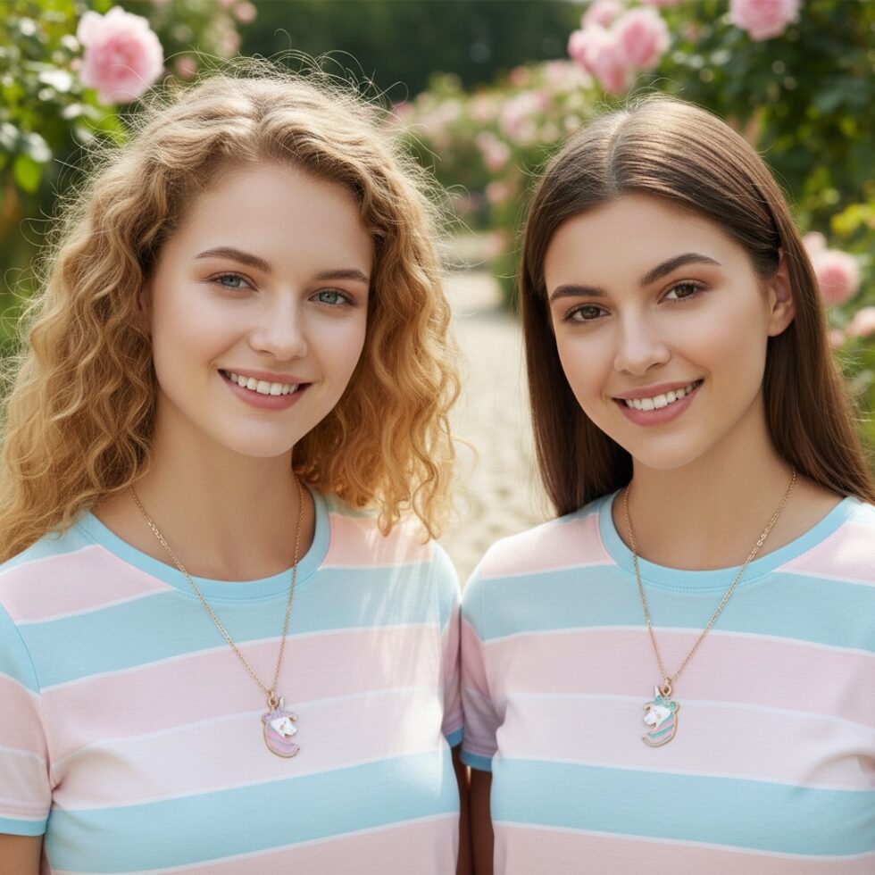 Celebrate a special friendship with The Mystical BFF Unicorn Set, a pair of matching necklaces perfect for best friends. Each necklace features a stylized unicorn head pendant crafted in colorful enamel, one with pink and purple accents, and the other with pink and light blue accents. Both pendants are suspended from a delicate gold-toned chain and are complemented by a small, rectangular charm stamped with the letters “BFF”. This playful and whimsical set is ideal for young wearers and makes a thoughtful, sentimental gift.
